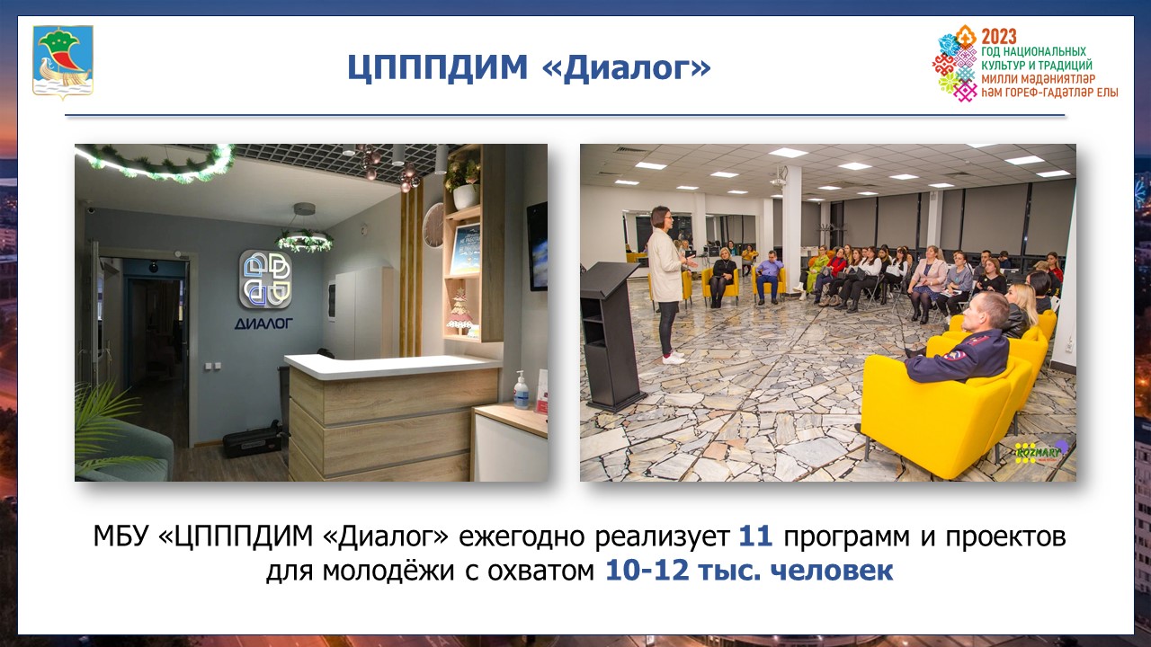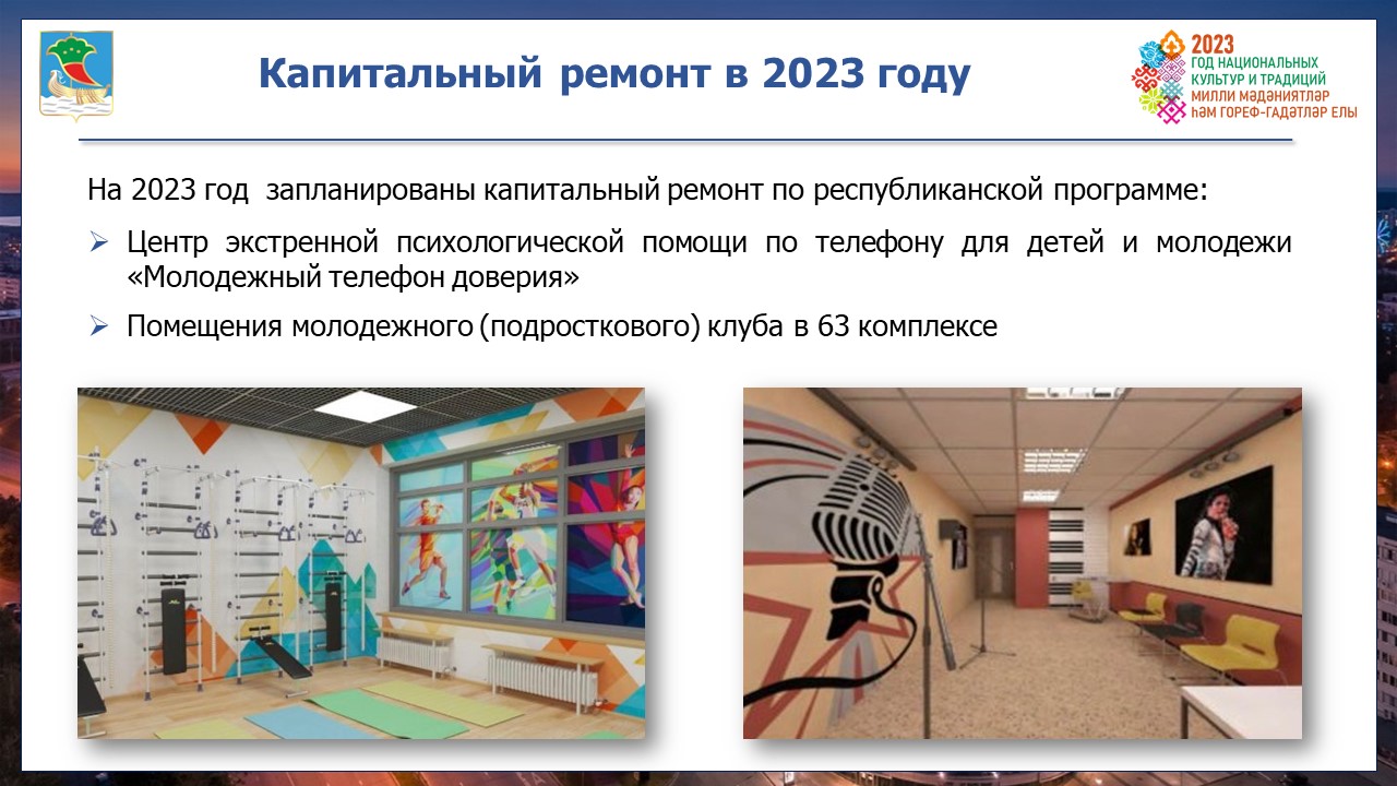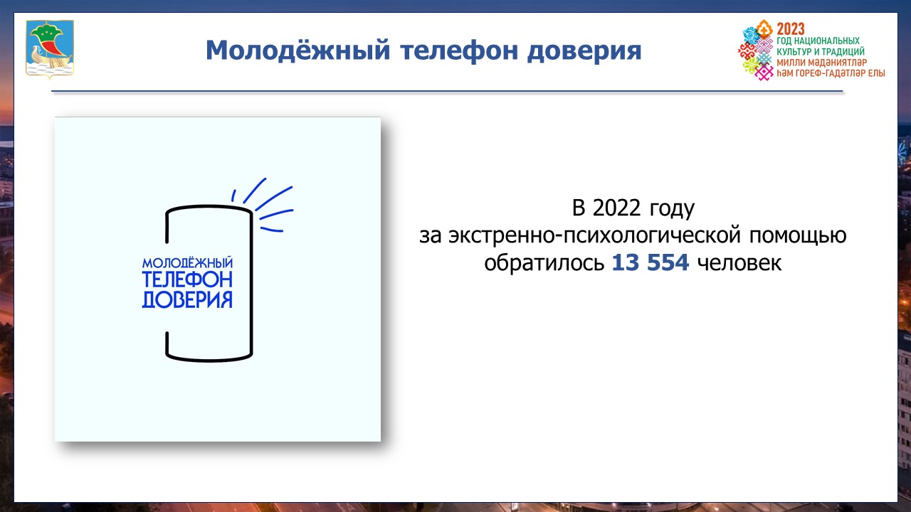 За индивидуальной психологической помощью к специалистам Центра «Диалог», где в прошел капремонт обратилось свыше 499 человек. Экстренную психологическую помощь подросткам и молодежи  круглосуточно, анонимно оказывает «Молодежный телефон доверия» на двух государственных языках: русский и татарский. В 2023 году по республиканской программе запланирован капитальный ремонт.