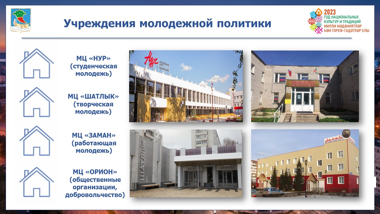 Сегодня в городе активно работают 4 молодежных центра и 44 общественных объединения. За последние 7 лет капитально отремонтированы 25 подростковых клубов, молодежные центры «Нур» и «Шатлык».
