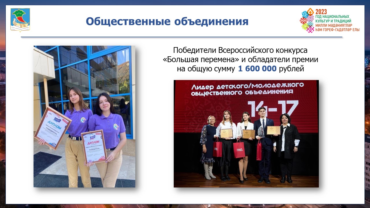 Челнинская молодежь ежегодно становится победителями и призерами всероссийских и республиканских мероприятий. В прошлом году наши ребята выиграли 27 грантов на сумму более 14,5 млн рублей. Ежегодно вручается 20 именных стипендий мэра города в области общественной деятельности, 10 премий для работников сферы молодежной политики.