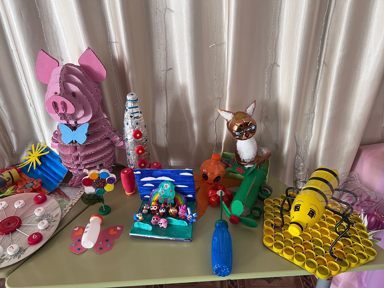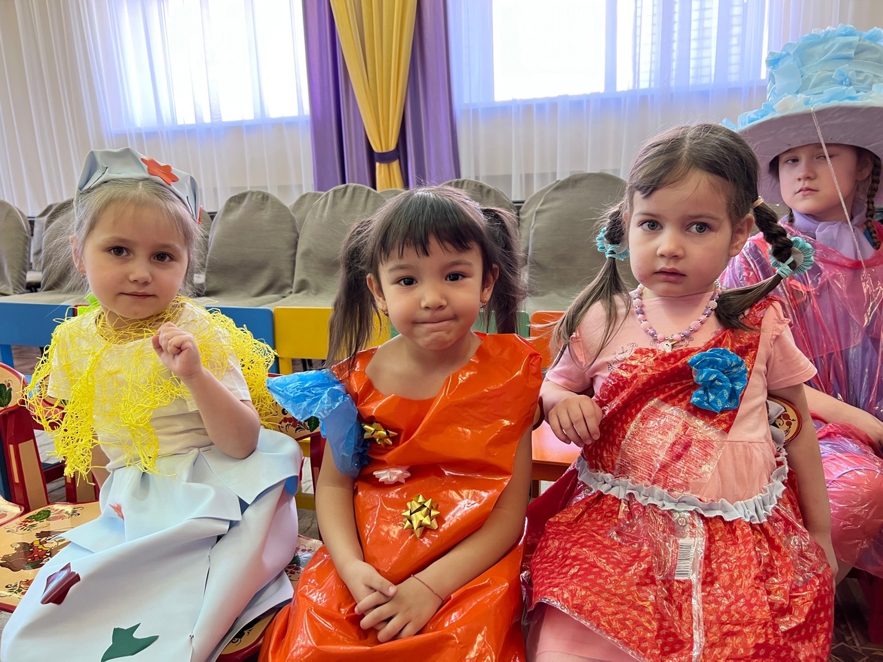 Ребята представили творческие работы из подручного бросового материала. Из обычных пластиковых ложек, крышек, палочек для суши, бутылок, вилок, тарелок, коробок, трубочек дети и родители смастерили поделки и костюмы для показа мод.