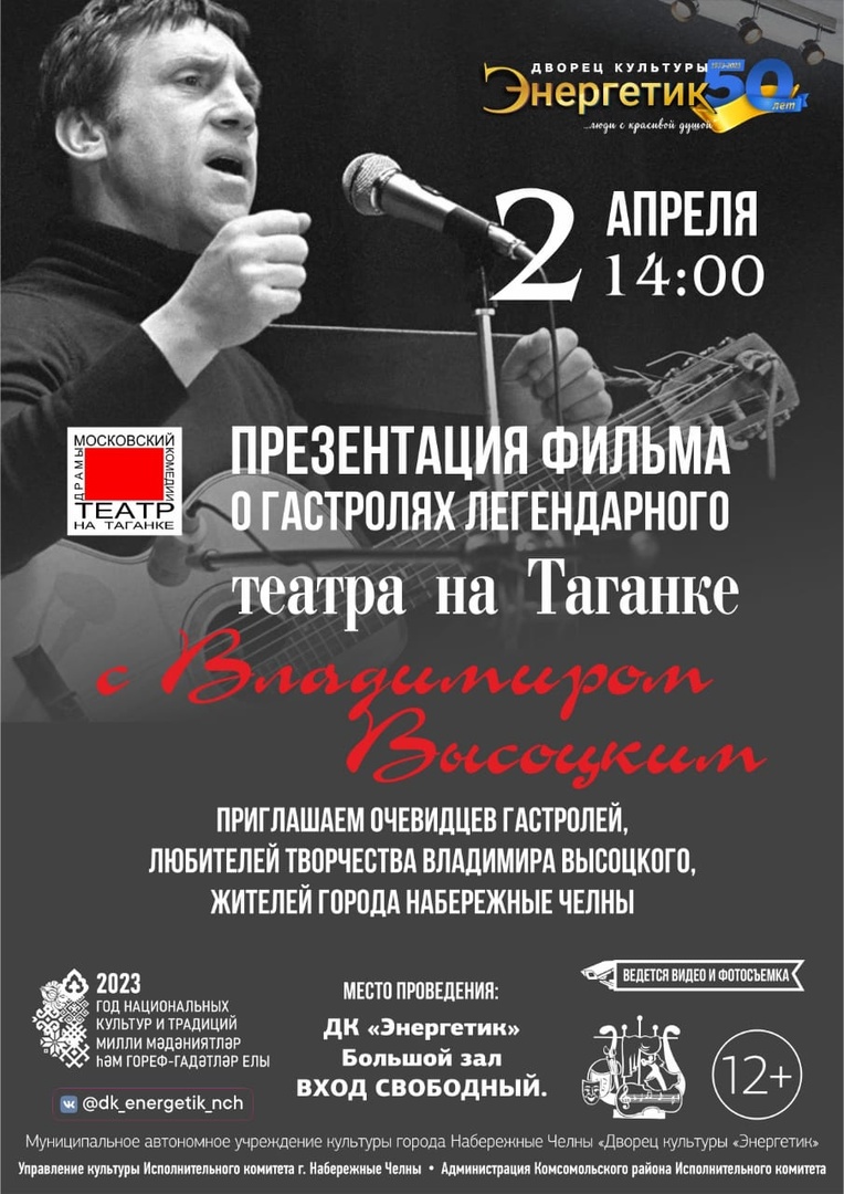 Впервые в городе Набережные Челны пройдёт презентация фильма о гастролях легендарного театра на Таганке с Владимиром Высоцким. Мероприятие пройдёт во Дворце культуры "Энергетик" 2 апреля в 14:00. Вход для всех желающих свободный.