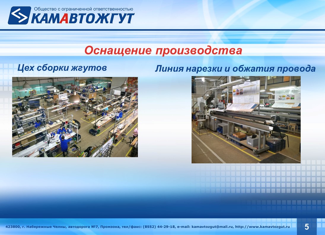 Следующая компания, «КамАвтоЖгут», предполагает расширение производства по изготовлению жгутов электрооборудования для коммерческого автомобильного грузового транспорта и спецтехники, общественного транспорта (автобусы, электробусы, троллейбусы), автотракторной техники, а также для промышленного оборудования.