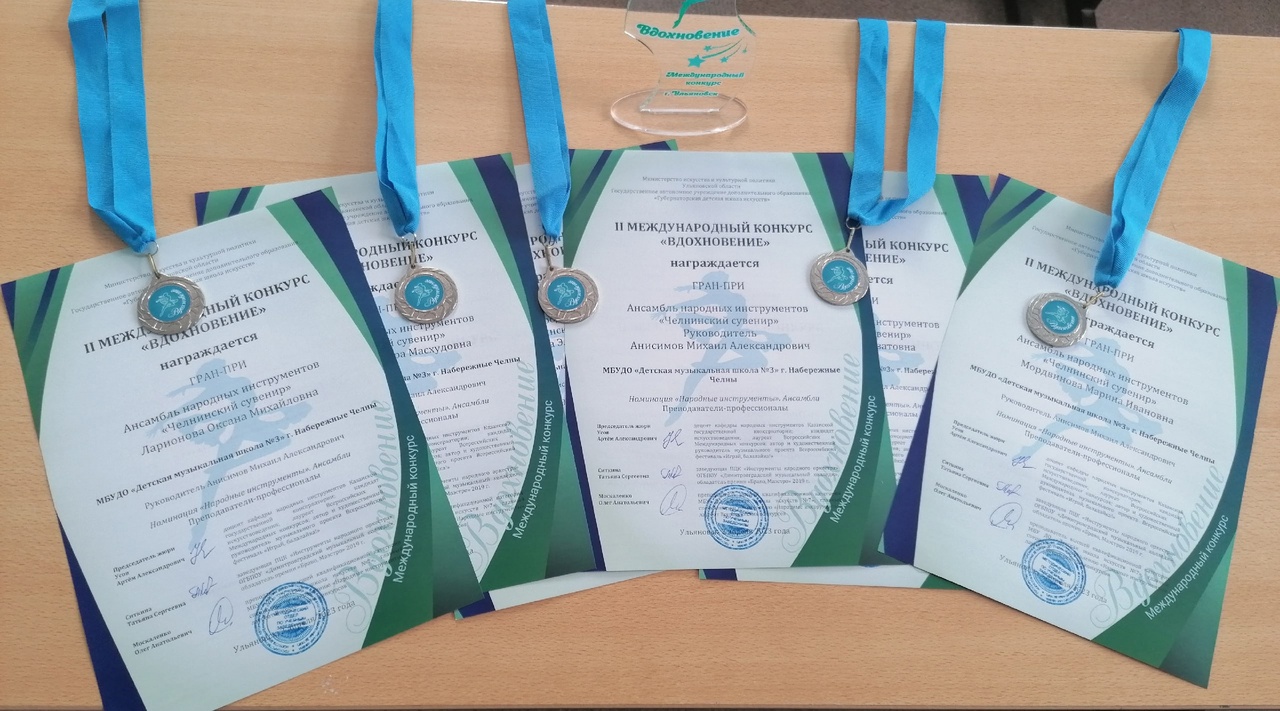В Ульяновске прошел II Международный конкурс "Вдохновение". Ансамбль народных инструментов Детской музыкальной школы №3 "Челнинский сувенир" стал обладателем Гран-при (художественный руководитель - заслуженный работник культуры РТ Михаил Анисимов). Коллектив показал высокое мастерство исполнения и тем самым покорил сердца слушателей и жюри конкурса.