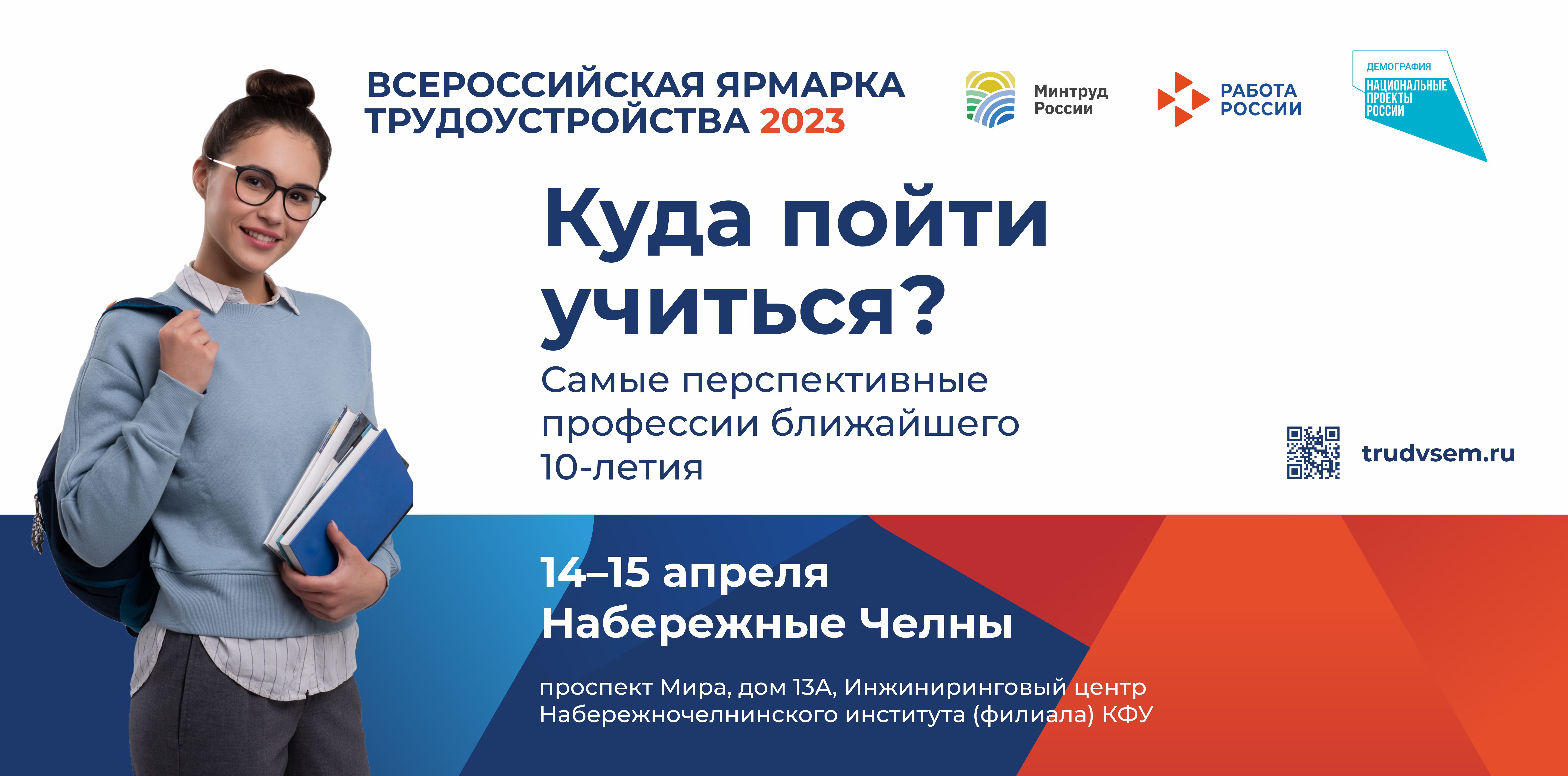 14 апреля в городе Набережные Челны стартует первый этап Всероссийской ярмарки трудоустройства «Работа России. Время возможностей». Основная цель ярмарки трудоустройства не только обеспечение кадровой потребности приоритетных для экономики предприятий, но и выстраивание доступных карьерных траекторий и информирование о перспективных профессиях.