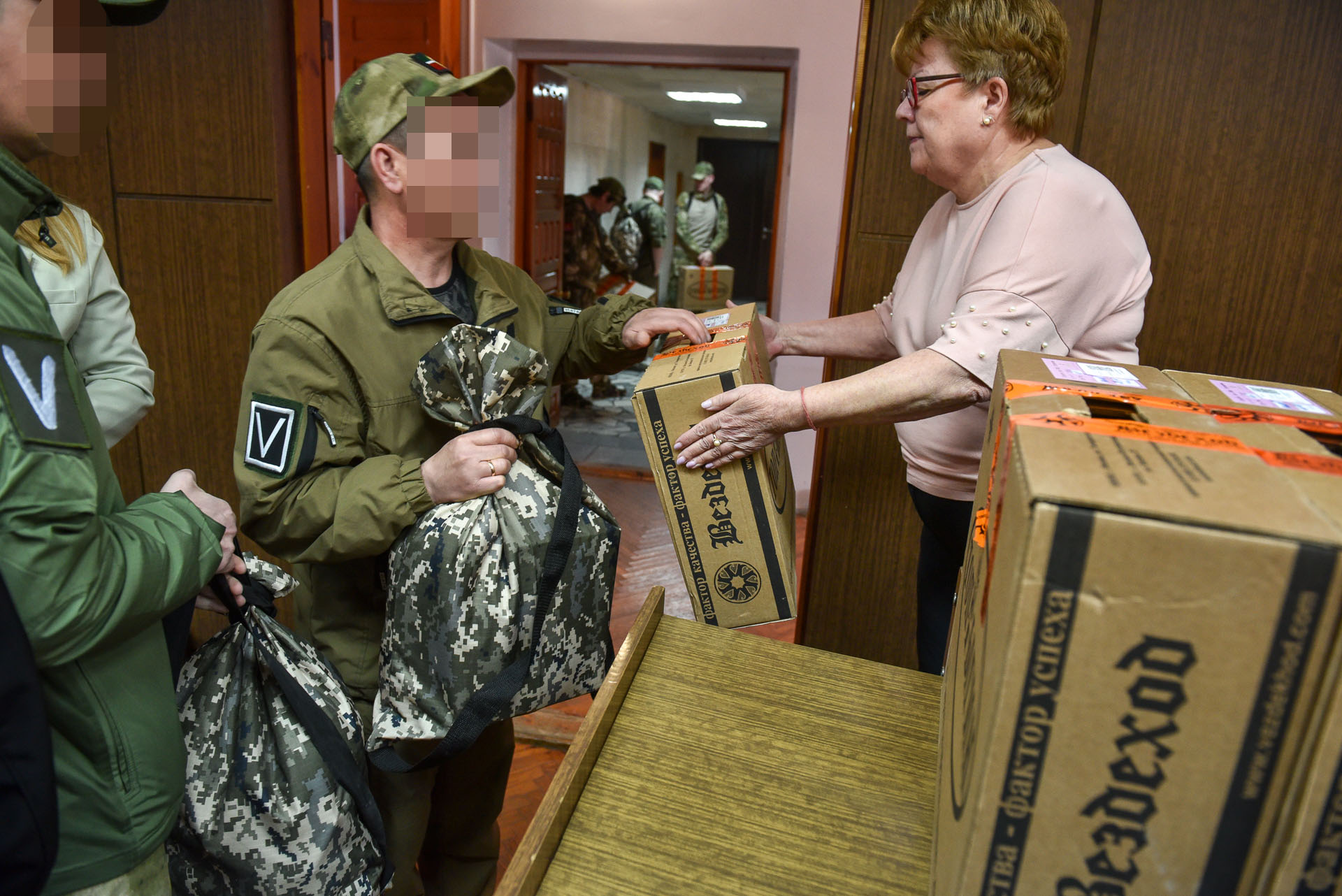 В завершение встречи мужчинам передали вещмешки с предметами первой необходимости, одежды и резиновые сапоги.
