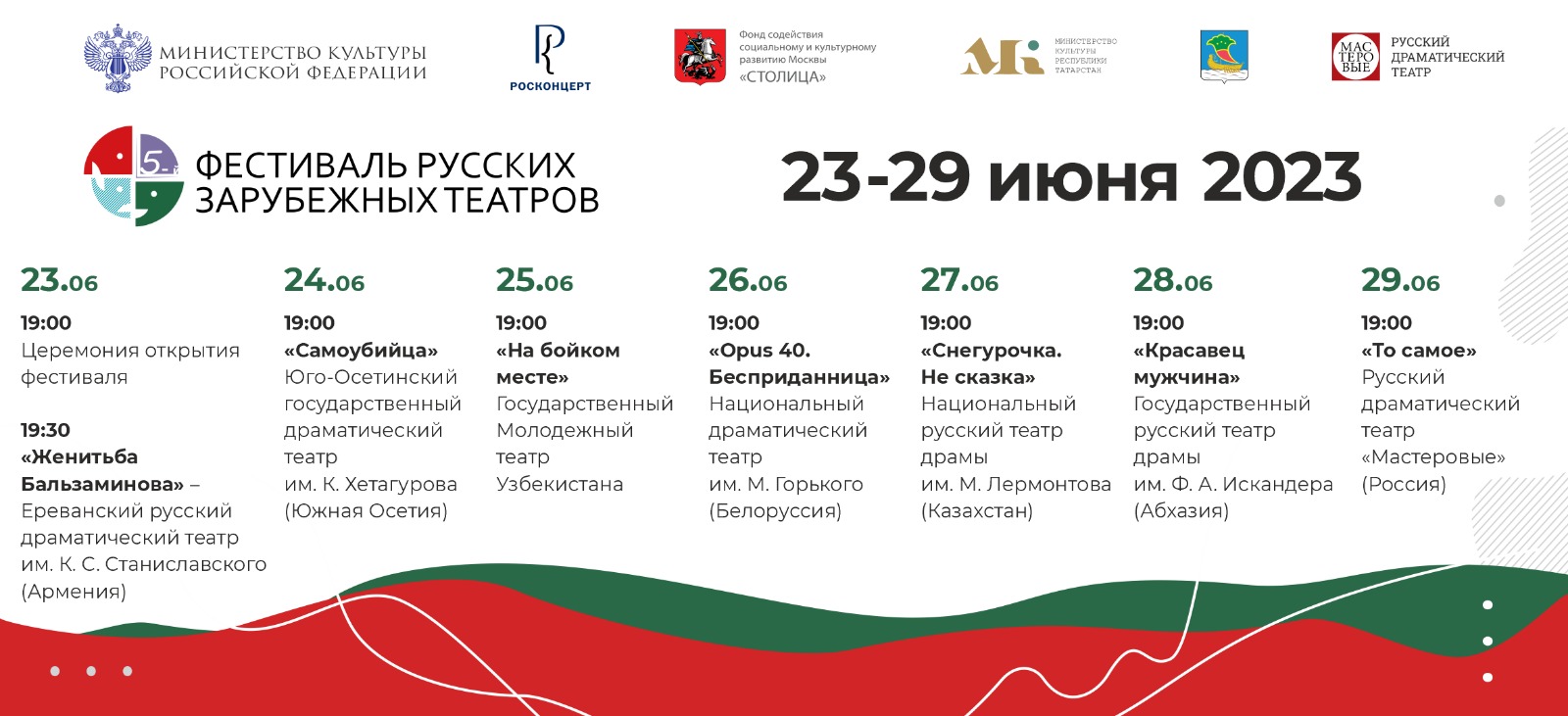 Так, в фестивале примут участие Ереванский русский драматический театр им. К.С. Станиславского (г. Ереван, Республика Армения), Юго-Осетинский государственный драматический театр им. К. Хетагурова (г. Цхинвал, Южная Осетия), Государственный Молодежный театр Узбекистана (г. Ташкент, Республика Узбекистан), Национальный драматический театр им. М. Горького (г. Минск, Республика Беларусь), Национальный русский театр драмы им. М. Лермонтова (г. Алматы, Республика Казахстан) и Государственный русский театр драмы им. Ф.А. Искандера (г. Сухум, Абхазия).