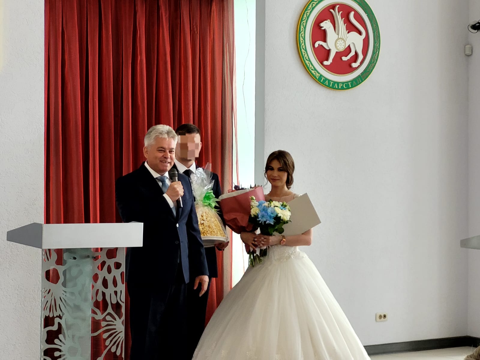 От имени мэра города Наиля Магдеева молодоженов поздравил глава администрации Автозаводского района Винер Харисов.