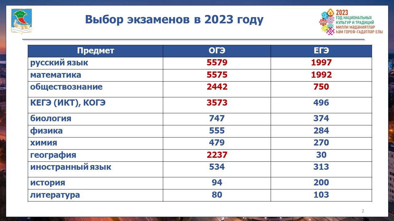 Экзамены для выпускников 9 классов начались 24 мая, в этот день школьники приняли участие в экзамене по родному татарскому языку. Экзамены для выпускников 11 классов начались 26 мая с экзаменов по химии, географии и литературе.