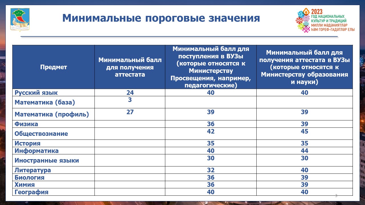 Ежегодно приказами Министерства просвещения и Министерства образования и науки Российской Федерации определяются минимальные баллы ЕГЭ для получения аттестата и поступления в государственные подведомственные вузы.