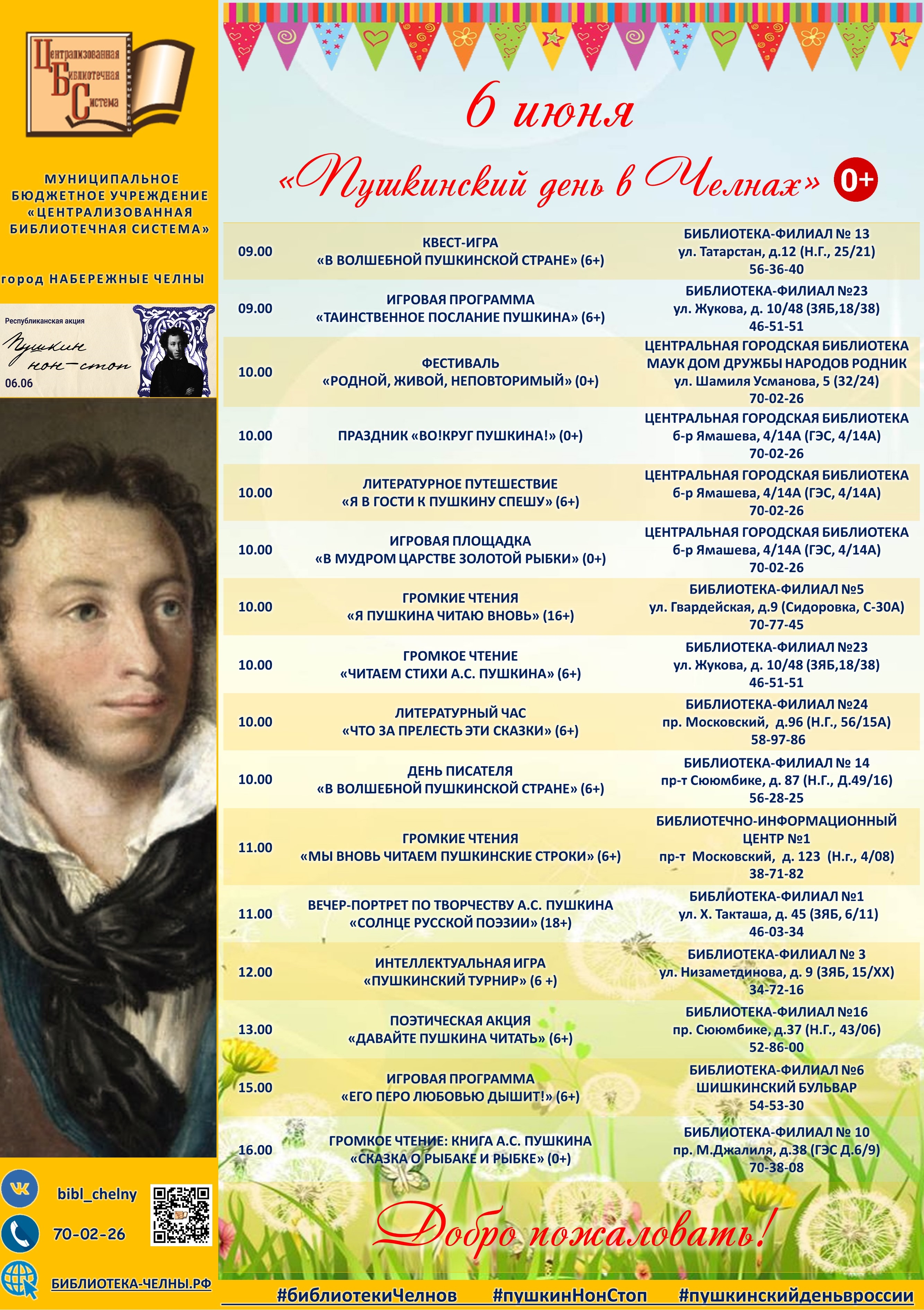 В этот же день во всех библиотеках Татарстана стартует республиканская акция «Пушкин нон-стоп». Все желающие приглашаются выступить в качестве чтецов – прочитать вслух отрывки из своих любимых произведений Александра Сергеевича Пушкина.