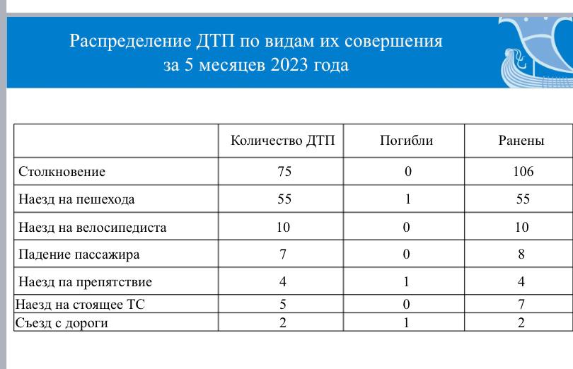 Основными видами происшествий являются: столкновение автомобилей; наезды на пешеходов; наезд на велосипедистов; падение пассажира; наезд на препятствие. Самыми незащищенными участниками дорожного движения являются пешеходы.