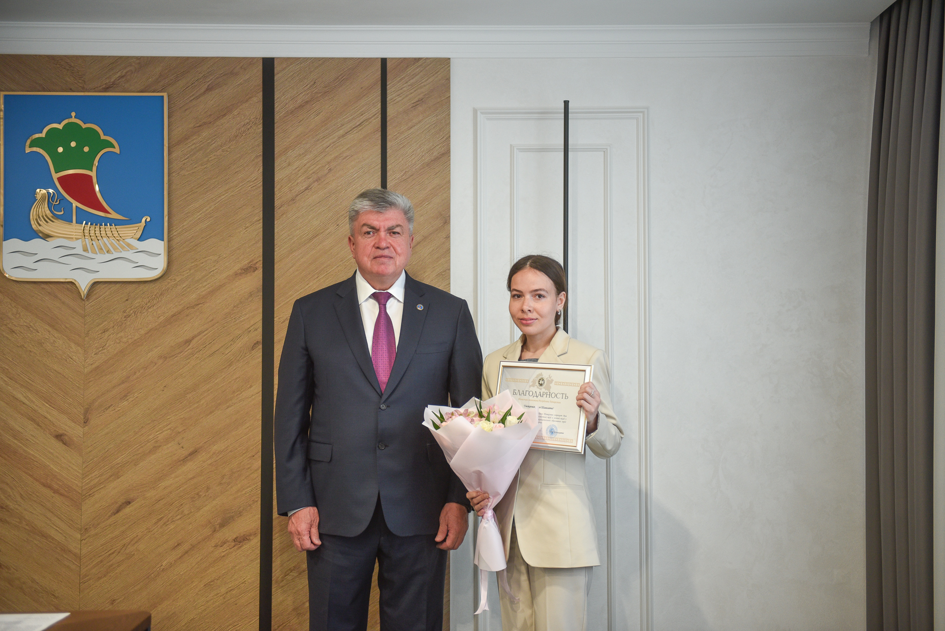Мэр города Наиль Магдеев передал и.о.заместителя руководителя Исполнительного комитета, начальнику отдела по развитию территории опережающего развития заслуженную награду.