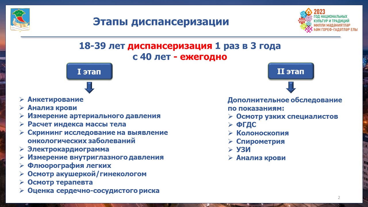 Диспансеризация проводится в два этапа. Первый этап включает в себя анкетирование, измерение артериального давления, расчет индекса массы тела, анализ крови, скрининг исследования на выявление онкологических заболеваний, проведение электрокардиограммы, измерение внутриглазного давления при прохождении впервые, и далее с 40 лет ежегодно, флюорография легких, осмотр акушеркой/гинекологом, осмотр терапевта, оценка сердечно–сосудистого риска.