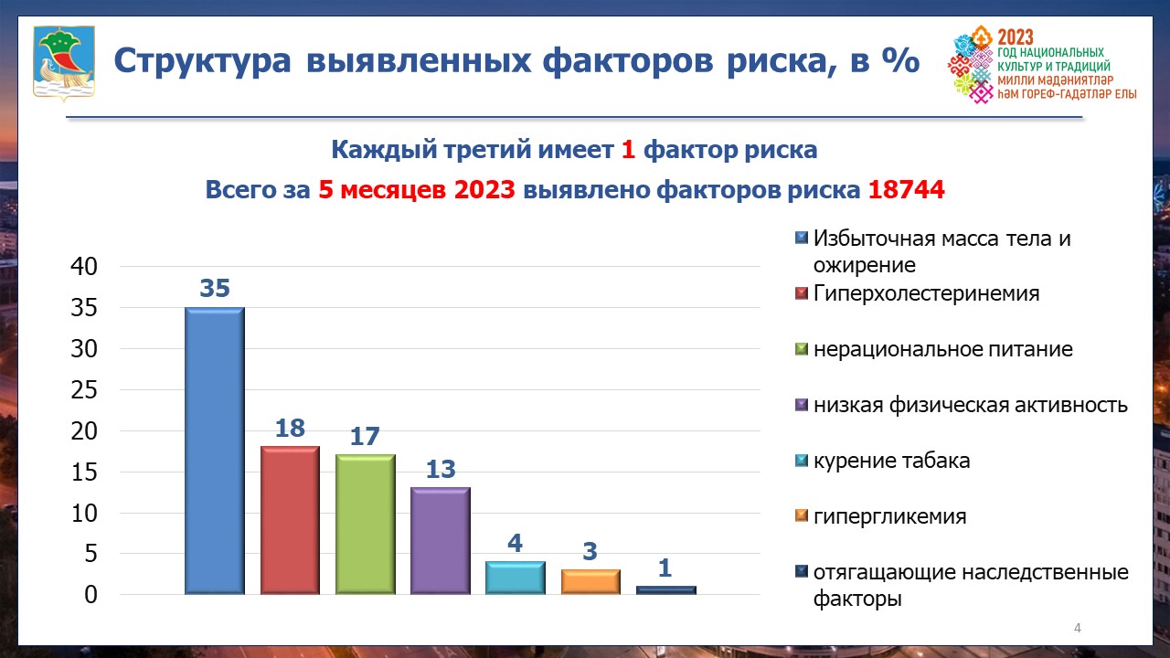По итогам проведенной диспансеризации за пять месяцев выявлено почти 19 тысяч факторов риска.Из них: избыточная масса тела и ожирение – 35%, гиперхолестеринемия – 18%, нерациональное питание – 17%, низкая физическая активность – 13%, курение табака – 4%, гипергликемия – 3%, отягощающие наследственные факторы – 1%. Данные цифры говорят о том, что каждый третий имеет один фактор риска развития хронических неинфекционных заболеваний.
