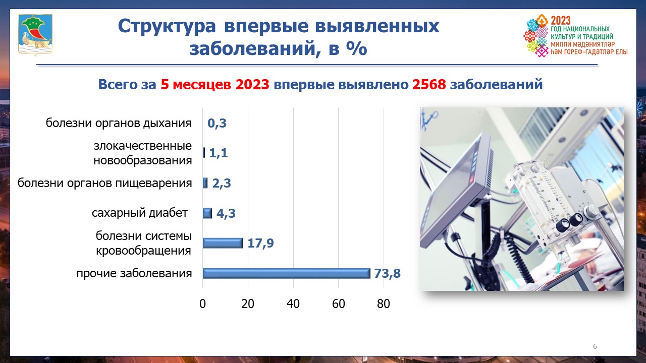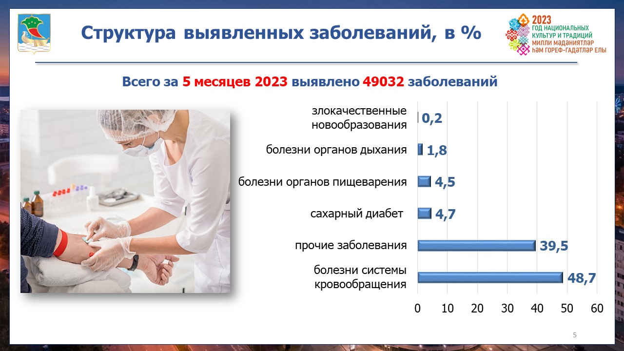 В структуре выявленных заболеваний лидирующее место занимает болезни системы кровообращения – 48,7%. В ходе диспансеризации впервые выявили 2568 заболеваний. Злокачественных новообразований выявлено 30 случаев (0,2%) от всех выявленных впервые заболеваний, из них 27 случаев выявлено на ранней стадии заболевания.
