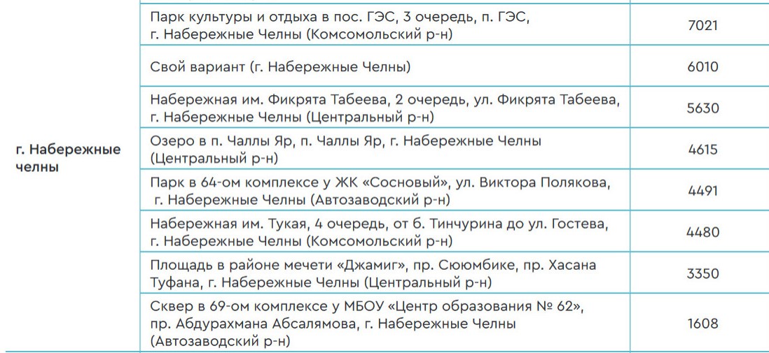 За парк свой голос отдали свой голос 11,5 тысяч челнинцев. Второе место по голосам занял парк Культуры и отдыха поселка ГЭС. Также можно было выбрать набережную им. Фикрята Табеева, набережную им. Габдуллы Тукая, озеро в поселке Чаллы Яр, парк в 64-ом комплексе, площадь в районе мечети «Джамиг»,сквер в 69-ом комплексе или свой вариант.