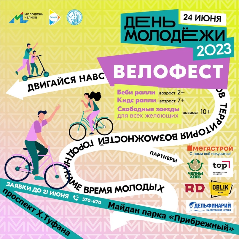 В День молодежи Молодежный центр «Заман» и Совет работающей молодежи приглашают жителей и гостей города на ВЕЛОФЕСТ. Напомним, данный проект стал победителем Всероссийского конкурса "Росмолодежь. Гранты: "Микрогранты". Мероприятие пройдет в рамках проведения праздника "День молодежи- 2023"!