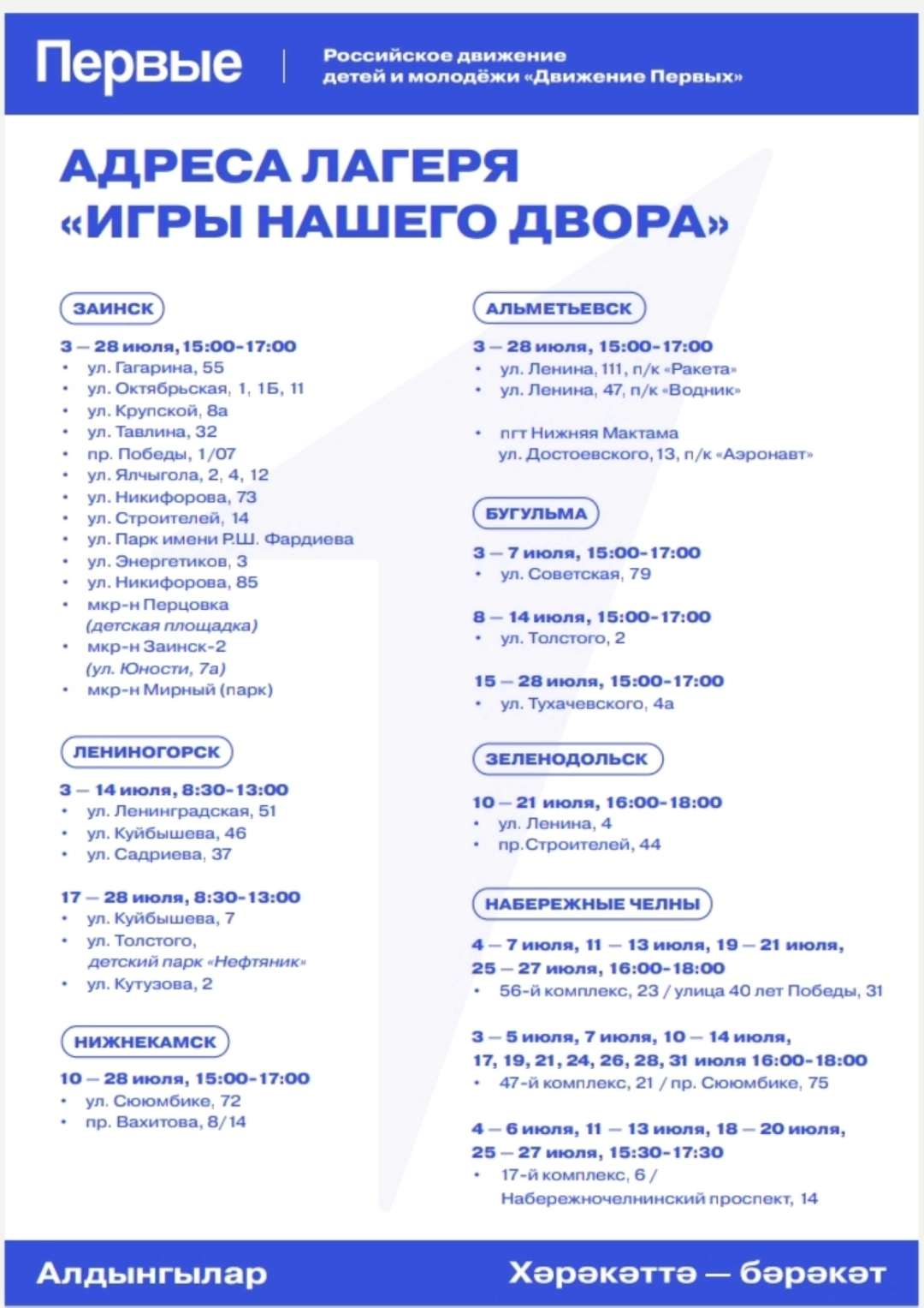3 июля в Набережных Челнах, Зеленодольском, Нижнекамском, Альметьевском и Бугульминском районах стартует лагерь «Игры нашего двора». Это альтернатива детского лагеря, который находится во дворе рядом с домом.