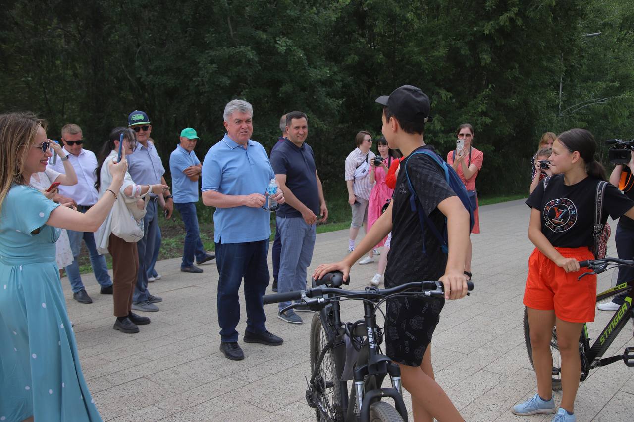 Первым делом Наиль Магдеев оценил входную группу парка, она расположена чуть поодаль от гимназии «Адымнар». Здесь уже построены здания, в которых вскоре будут располагаться торговые точки.