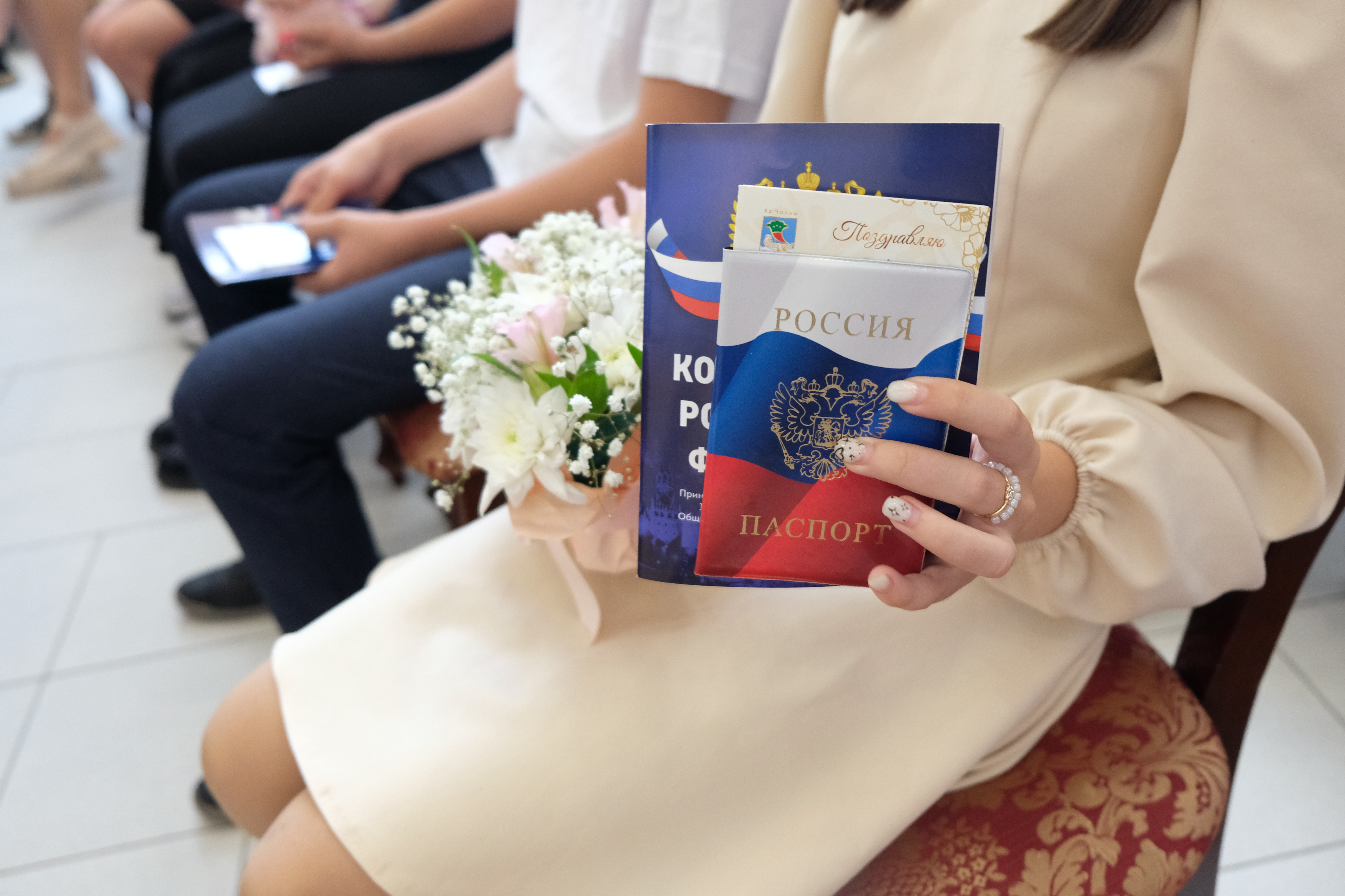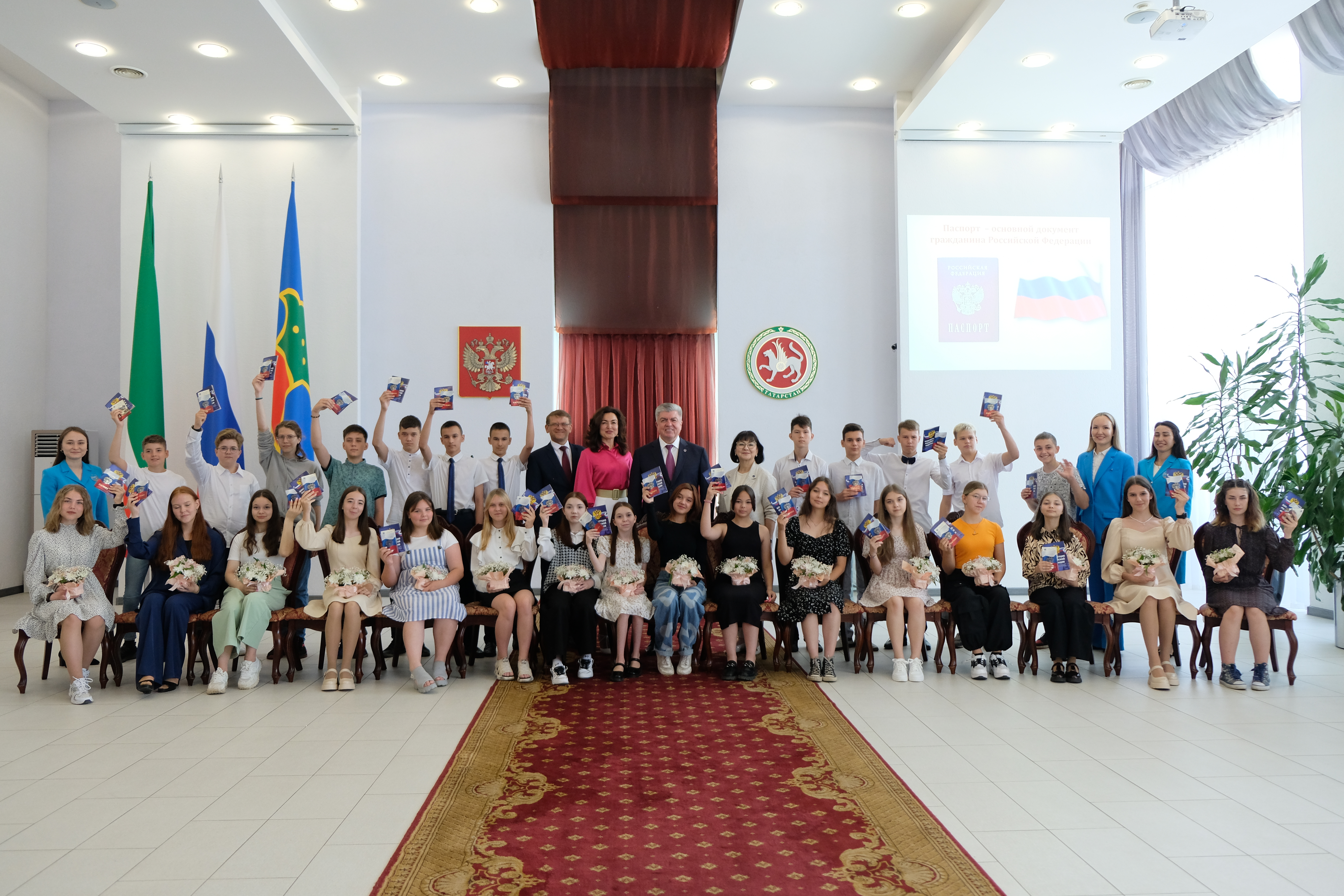 Паспорт сегодня получили 28 юных граждан. Также им вручили Конституцию Российской Федерации, обложки на основной документ, а девушкам – цветы.