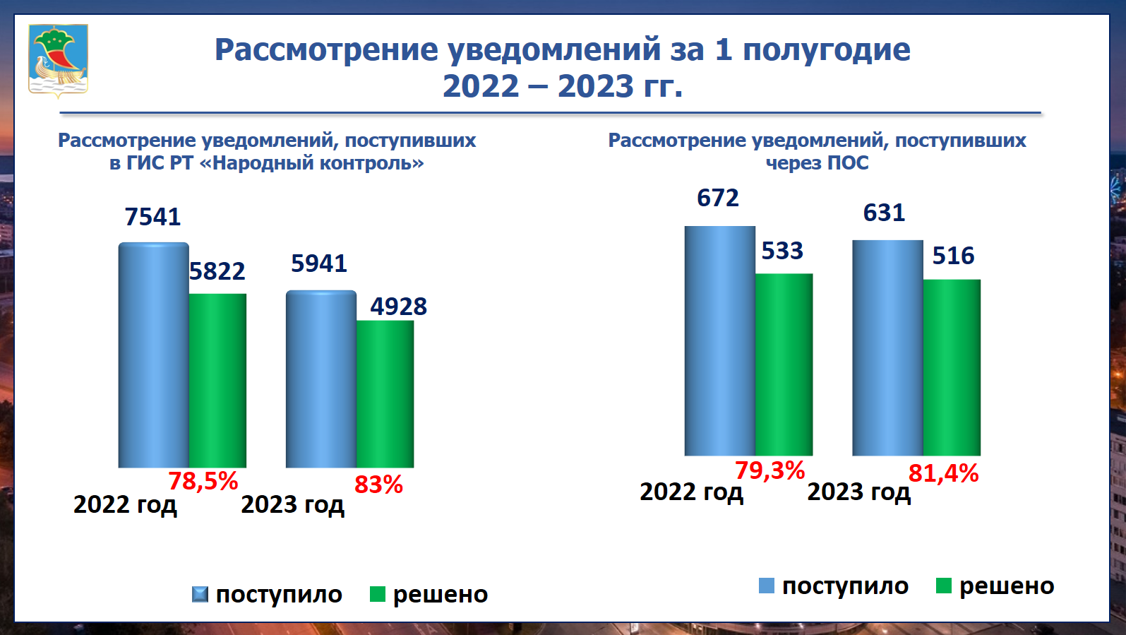 Всего же за указанный период Исполнительным комитетом города Набережные Челны рассмотрено 5 941 уведомление, из них 631, поступившее через Платформу обратной связи. Решено за данный период 4 928 уведомлений. В настоящее время доля решенных уведомлений составляет 83%, что, по сравнению с аналогичным периодом 2022 года, выше на 5%.