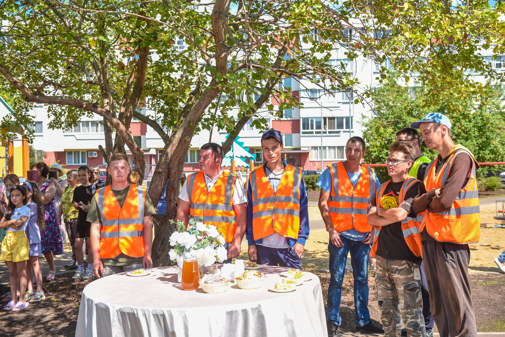 Сегодня жители дома 22/15 вместе с администрацией Автозаводского района устроили для строителей «Нашего двора» праздничный обед. Поблагодарить людей труда пришел и мэр города Наиль Магдеев.