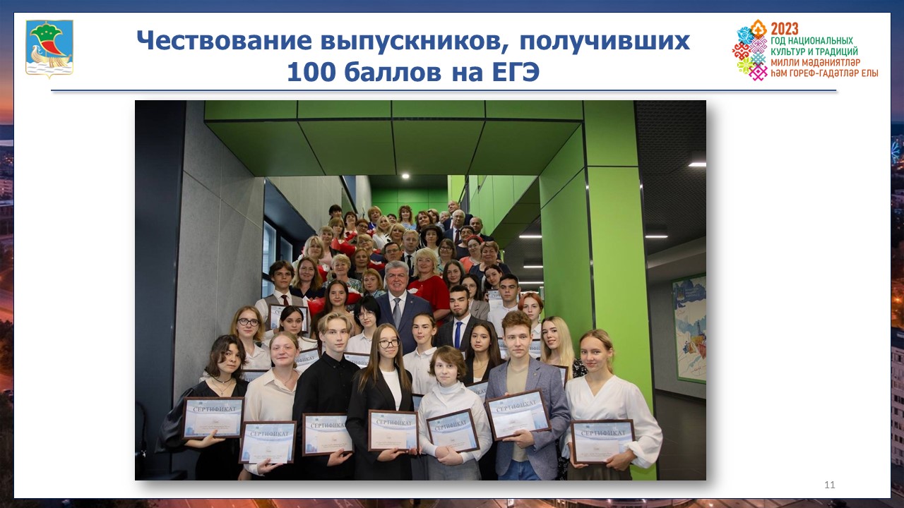 «На примере лучших должны работать и другие трудовые коллективы школ. Среди лучших наших школ есть не только гимназии, лицеи, но и обычные школы. Уже сегодня обычные школы показывают результаты наряду с гимназиями и лицеями, и количество 100-балльников, и количество детей, которые смогли получить 80 баллов и выше на ЕГЭ есть даже в обычных школах. Это говорит о том, как руководитель школы может создать хорошую атмосферу, команду учителей и вне зависимости от того гимназия это, лицей или обычная школа готовит конкурентоспособных для большой жизни детей», – отметил мэр города Наиль Магдеев.
