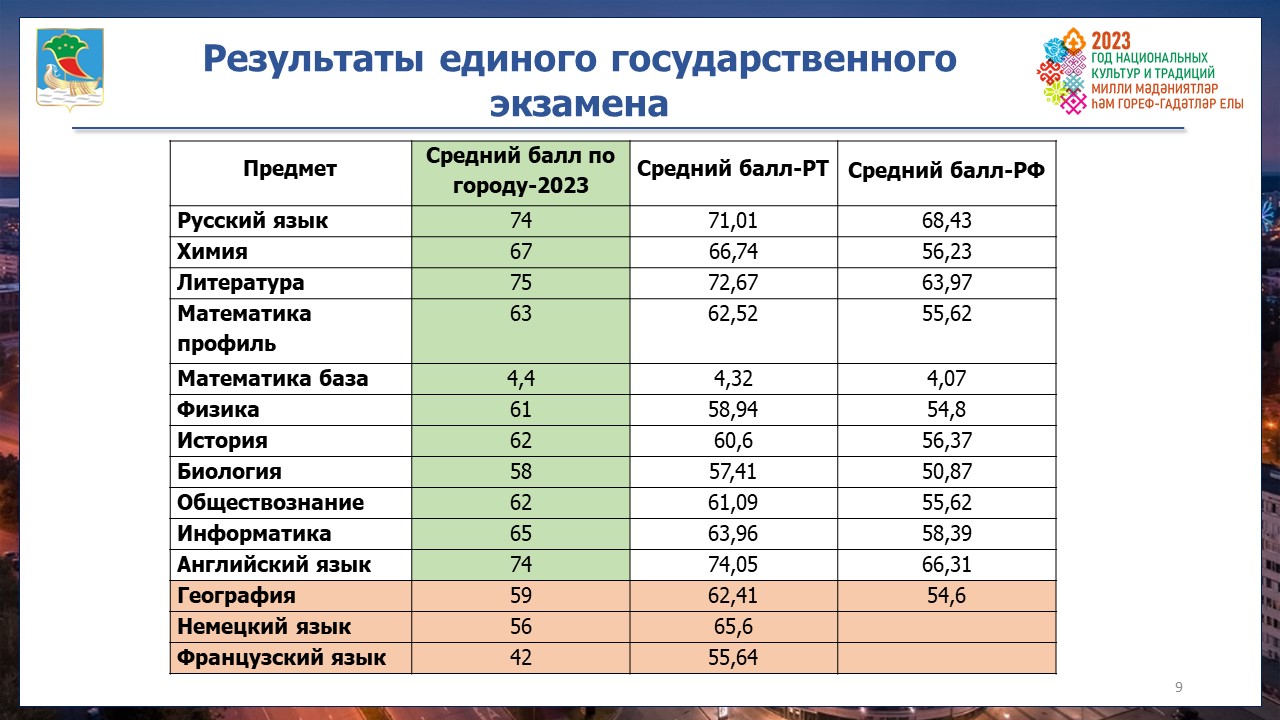 Отметим, что средний балл по всем предметам кроме географии, иностранных языков, выше российских показателей и показателей Республики Татарстан. 26,1% выпускников получили от 80 баллов. В то же время десять выпускников школ не подтвердили медали. Без аттестата остались 12 выпускников школ.