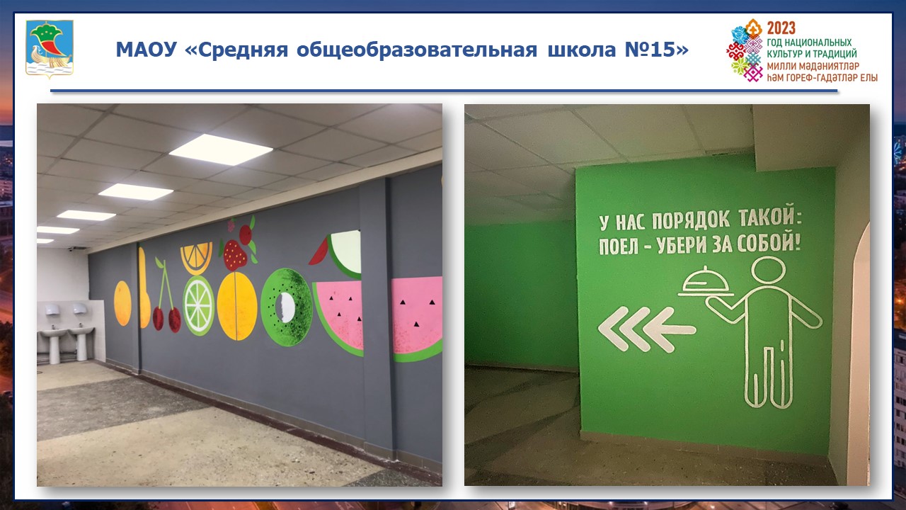 В рамках республиканской программы «Капитальный ремонт пищеблоков общеобразовательных организаций Республики Татарстан с приобретением оборудования» выполняется ремонт пищеблоков на общую сумму 107,5 млн рублей в семи школах: №№ 3, 12, 15, 23, 35, 48, 58. В настоящее время ведется замена инженерных коммуникаций, выполняются отделочные работы, будет установлено новое оборудование: холодильное, горячего цеха, посудомоечное, вентиляционное, а также будет выполнена меблировка обеденного зала. Школьные столовые обретут новый облик. Общая готовность – 51%.