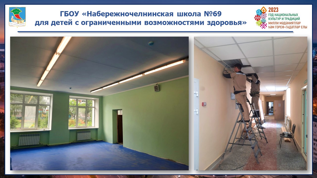 По республиканской программе капитального ремонта общеобразовательных организаций для детей с ограниченными возможностями здоровья и со специальным наименованием выполняется капитальный ремонт Набережночелнинской школы № 69 для детей с ограниченными возможностями здоровья. Выделенный лимит финансирования – 55,1 млн. рублей. Завершается монтаж окон и дверей, ремонт лестниц, отделочные работы. Ведутся работы по устройству фасада и входных групп, монтаж внутренних инженерных сетей, установка автоматической пожарной системы и видеонаблюдения. Общий объем выполненных работ – 87%.
