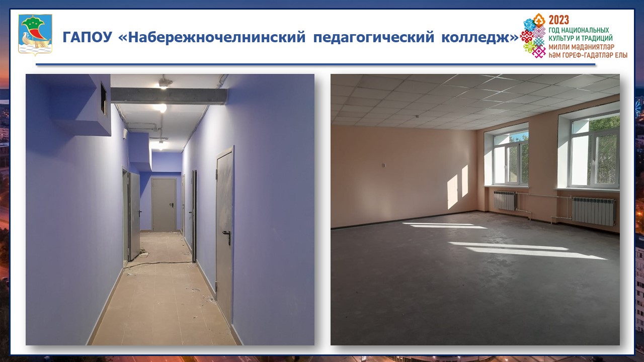 По республиканской программе капитального ремонта ресурсных центров для удовлетворения кадровых потребностей работодателей на выделенный лимит финансирования – 44,5 млн рублей проводится ремонт Набережночелнинского педагогического колледжа. В колледже ведутся отделочные работы в учебной зоне, замена дверей, электромонтажные работы, монтаж ограждения территории. Общая готовность – 77%.