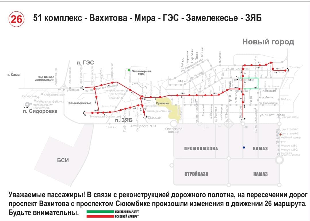 До 5 августа изменена схема движения автобусов 26 маршрута. Это связано с с ремонтом дороги, на пересечении проспекта Вахитова и Сююмбике.