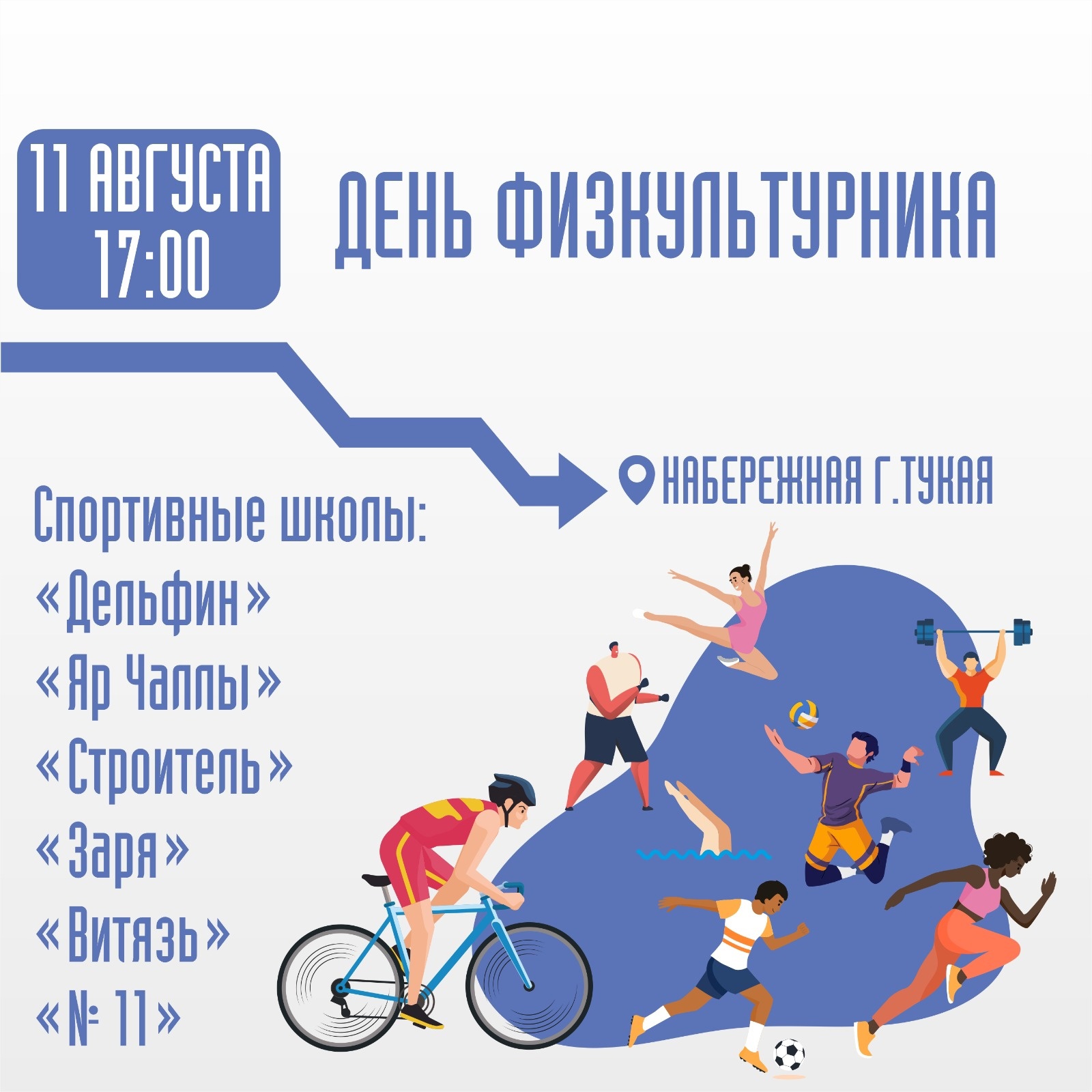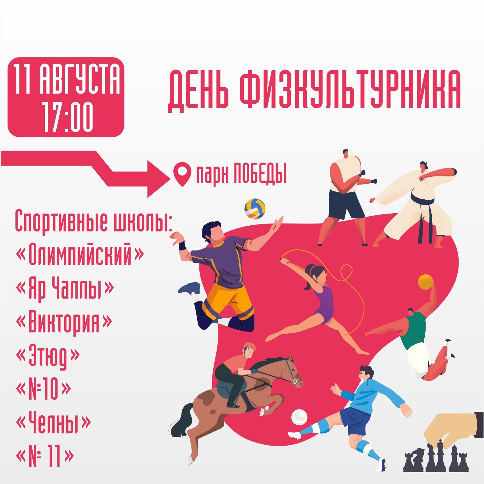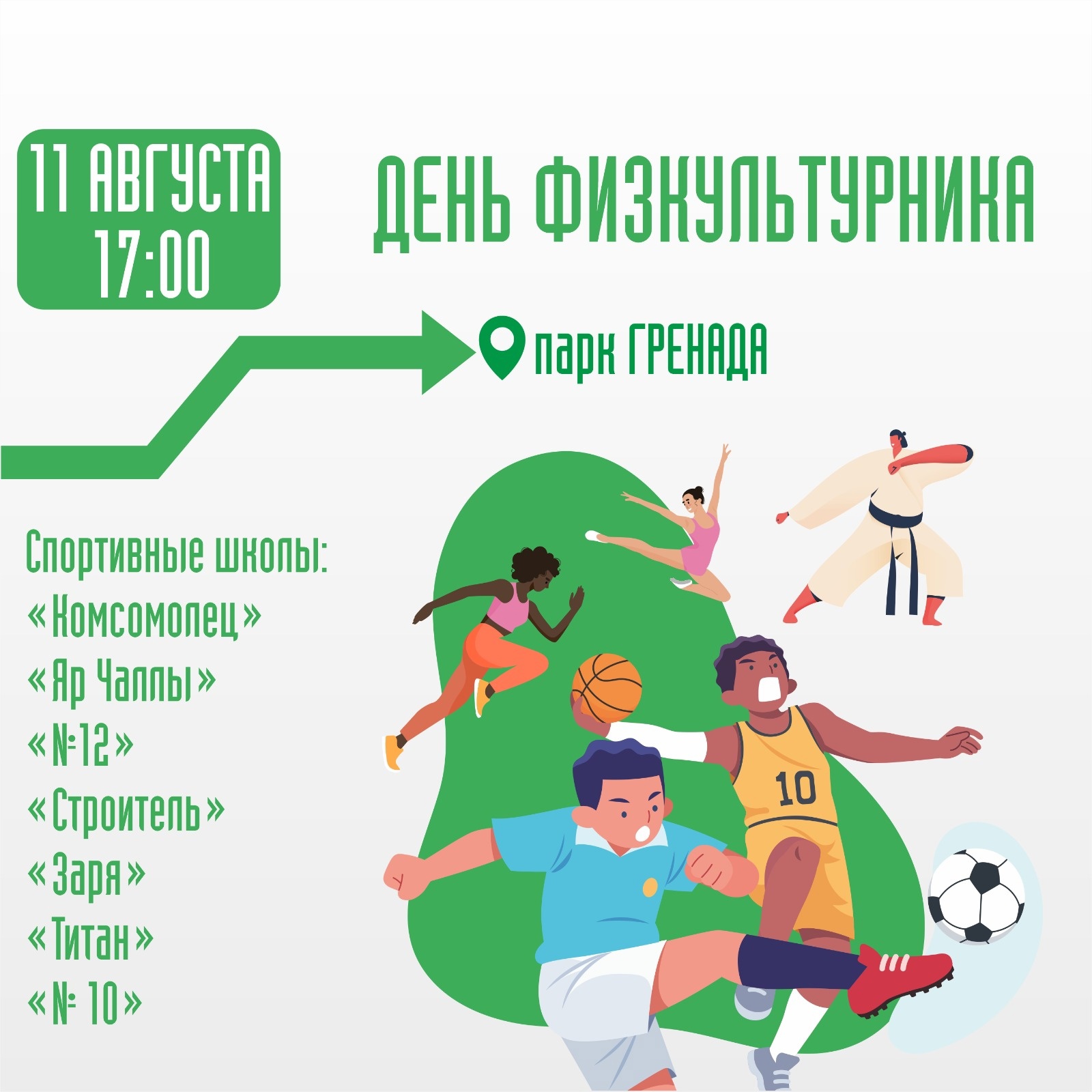 11 августа с 17.00 на территории Парка Победы, Парка Гренада и набережной им. Г. Тукая (в районе сцены) состоится день открытых дверей спортивных учреждений города.