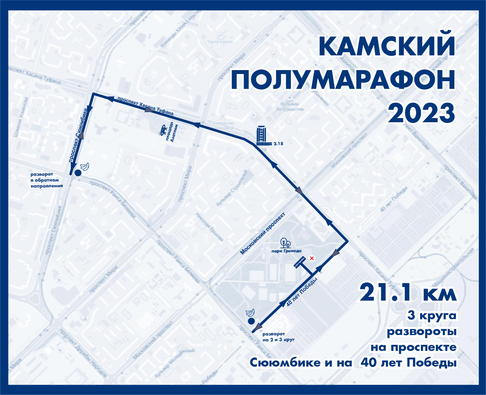 "Маршрут забега пройдет по центральным проспектам города: Хасана Туфана, 40 лет Победы, Сююмбике. на время полумарафона будет организовано перекрытие дорог. Просим заранее планировать свои маршруты передвижения", – отметил начальник управления спорта Роман Насрединов в ходе пресс-конференции.