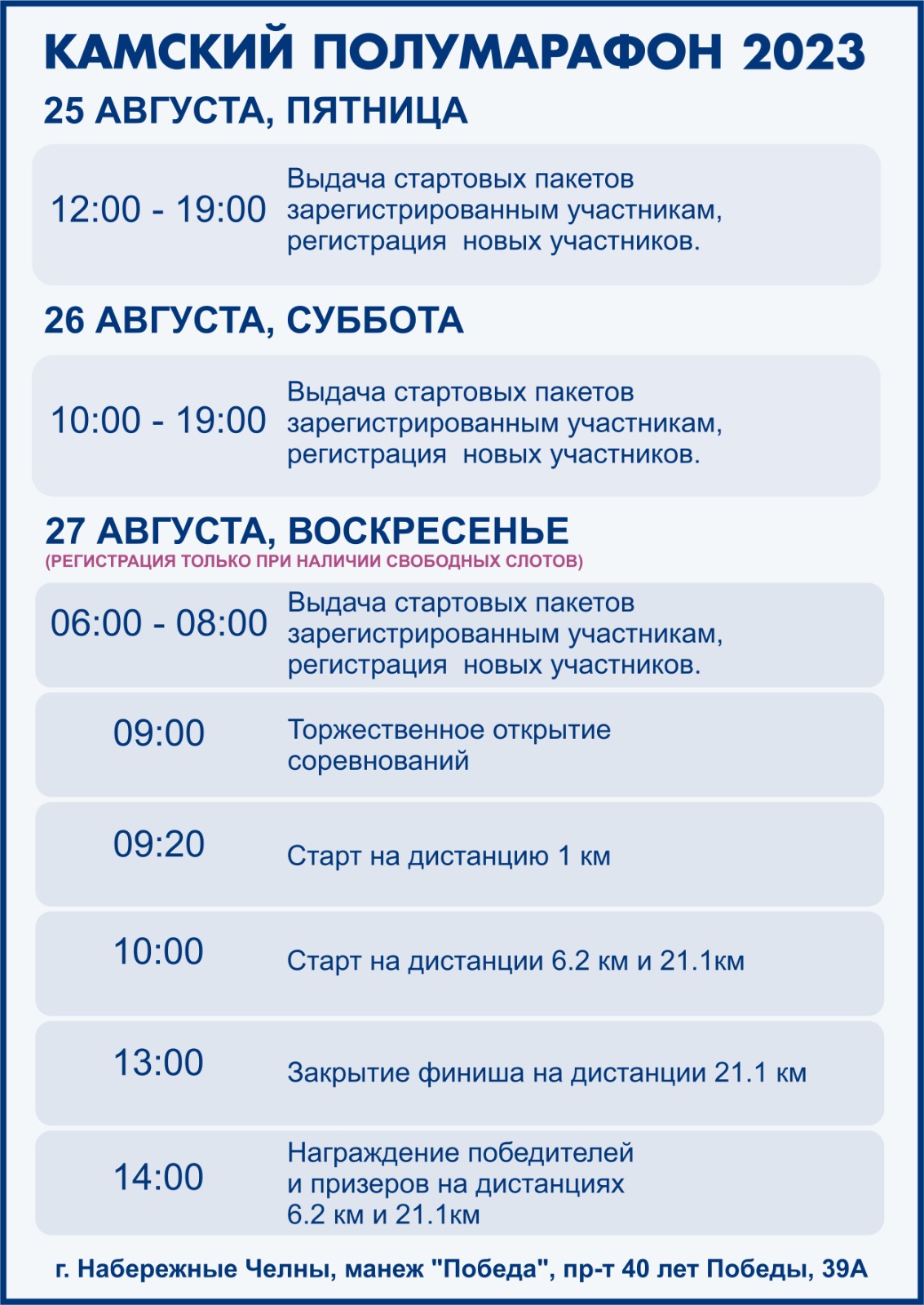 27 августа в Набережных Челнах состоятся традиционные массовые соревнования по бегу «Камский полумарафон». В соревнованиях планирует принять участие более 500 спортсменов, включая взрослых и детей. Участники смогут преодолеть одну из дистанций: 1, 6,2 или 21,1 км.