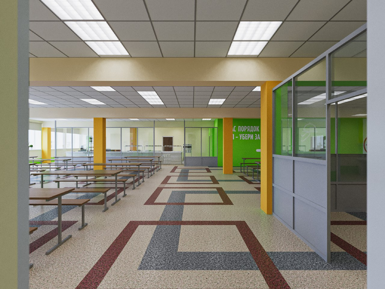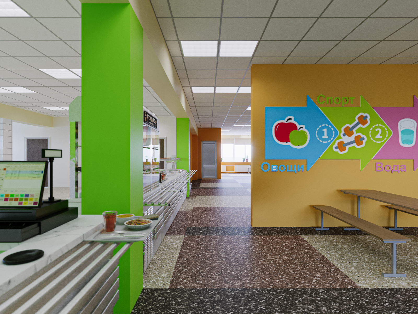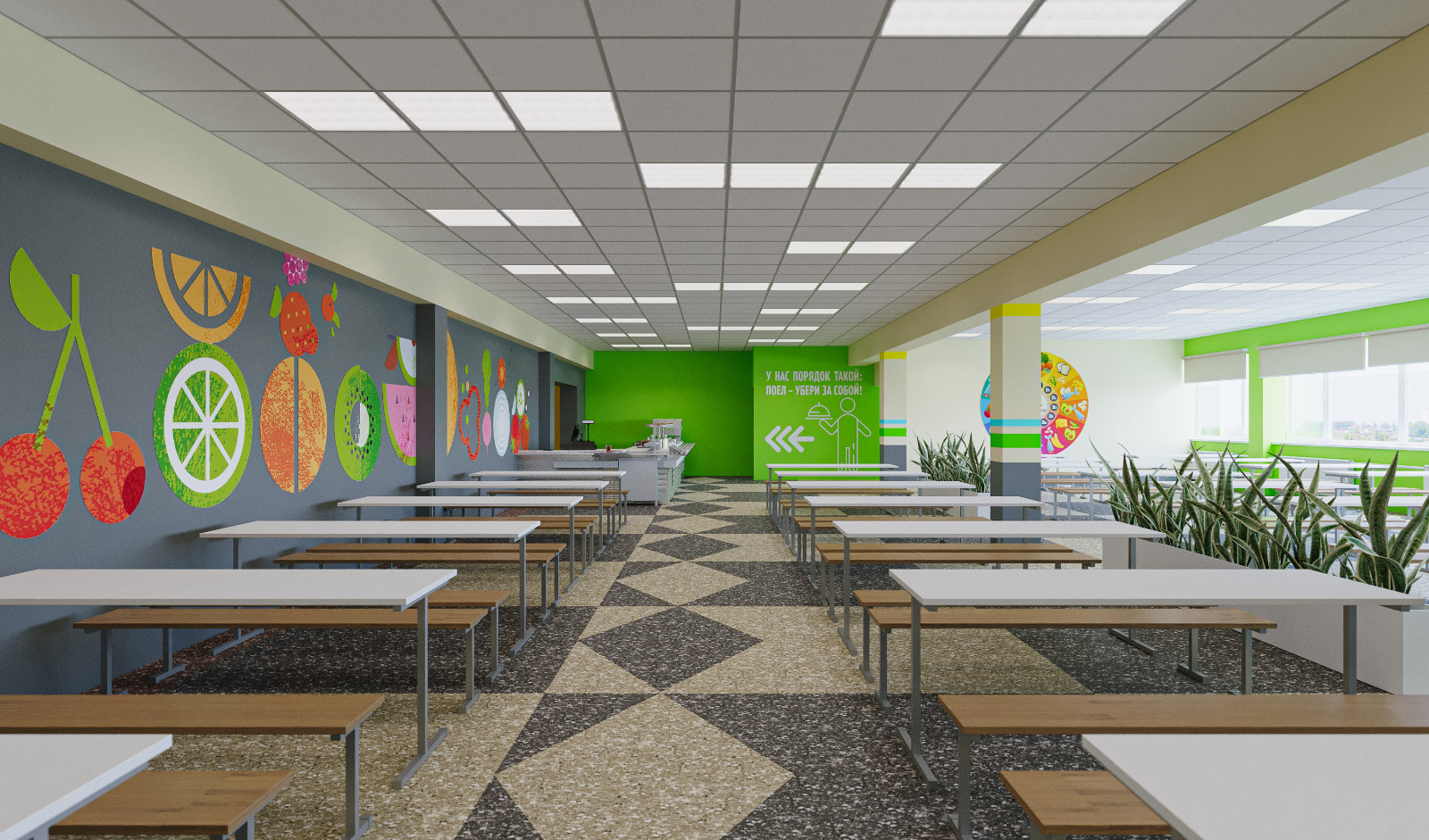 «Не будем ограничиваться типовой покраской стен, разработали дизайн столовых. Это позволяет избежать однотипности. Покраска влагостойкая, износостойкая. Преследовали цель: чисто и аккуратно, - рассказала Малика Шамсиева. – Отделили общий зал для отдельного приема еды учителей. Сделали место, чтобы дети сами убирали за собой посуду. Оформили композицию на тему здоровой пищи».