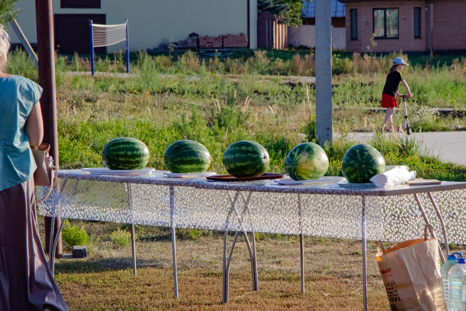 Весь вечер жителей и гостей поселка угощали арбузами.
