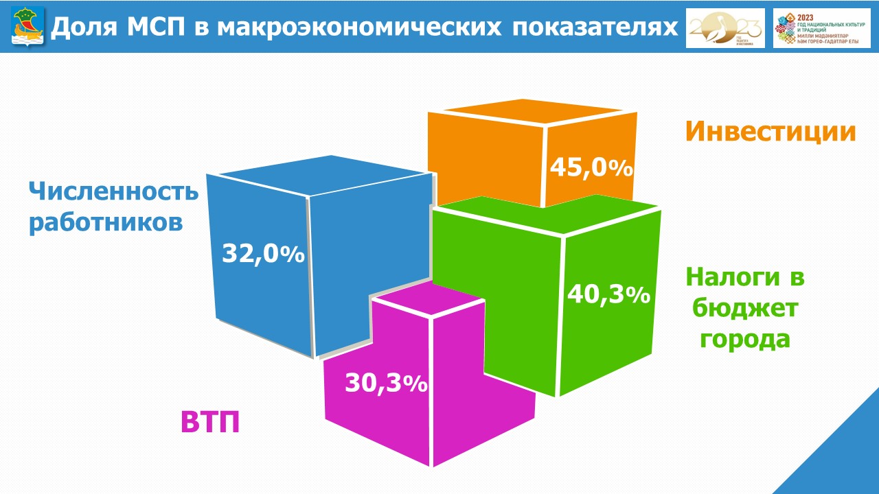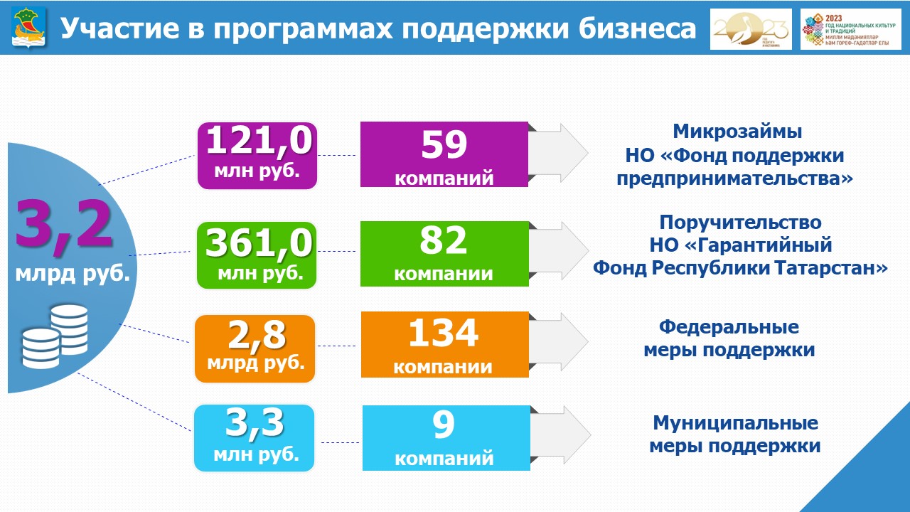 Мерами поддержки смогли воспользоваться 275 субъектов МСП, что составляет 12 % от общего количества получивших поддержку по Республике Татарстан. Предприятиями получены финансовые ресурсы в сумме 3,2 млрд рублей. на модернизацию и приобретение оборудования, транспорта и на пополнение оборотных средств.