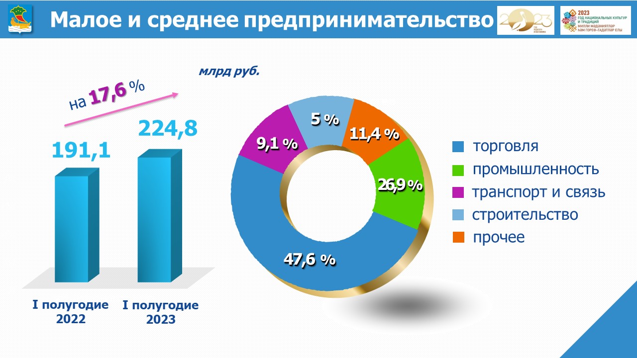 Сфера предпринимательства формирует практически третью часть экономики Набережных Челнов и более 40% бюджета города. По итогам 1 полугодия текущего года оборот субъектов малого и среднего предпринимательства вырос на 17,6% и составил 224,8 млрд руб.
