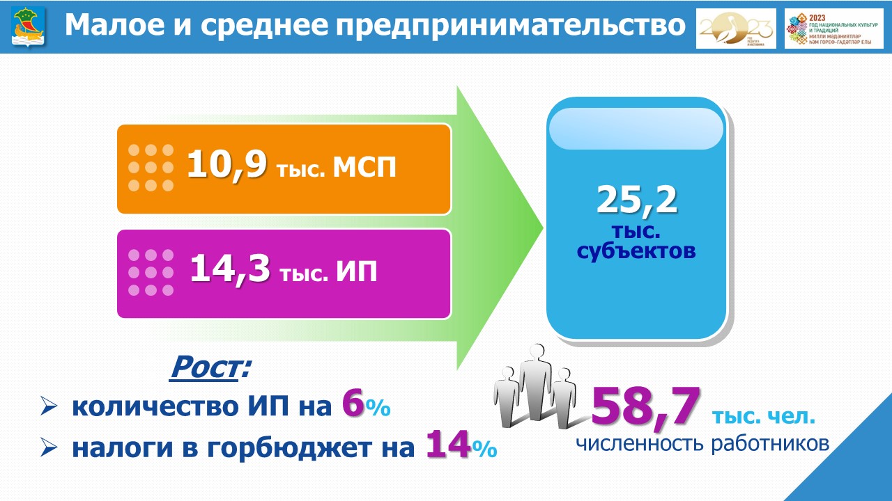 В этой сфере трудятся 58,7 тыс. человек, с учетом наемных работников у индивидуальных предпринимателей – почти 90 тысяч человек. Налоговые поступления от ведения предпринимательской деятельности в городской бюджет составили 1 млрд 147 млн руб. В настоящее время предпринимательский сектор растет и за счет самозанятых, их почти 34 тысячи.