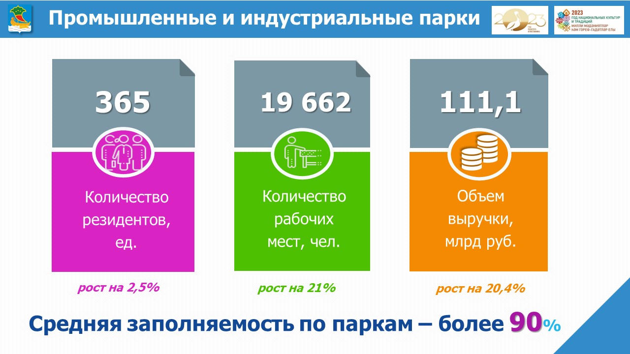 На территории парков осуществляют деятельность 365 резидентов. Численность работников выросла на 21% и составила 19,6 тысяч человек. Объем отгруженной продукции составил 111 млрд рублей или 120,4% к прошлому году. Средняя заполняемость по всем паркам составляет более 90%.