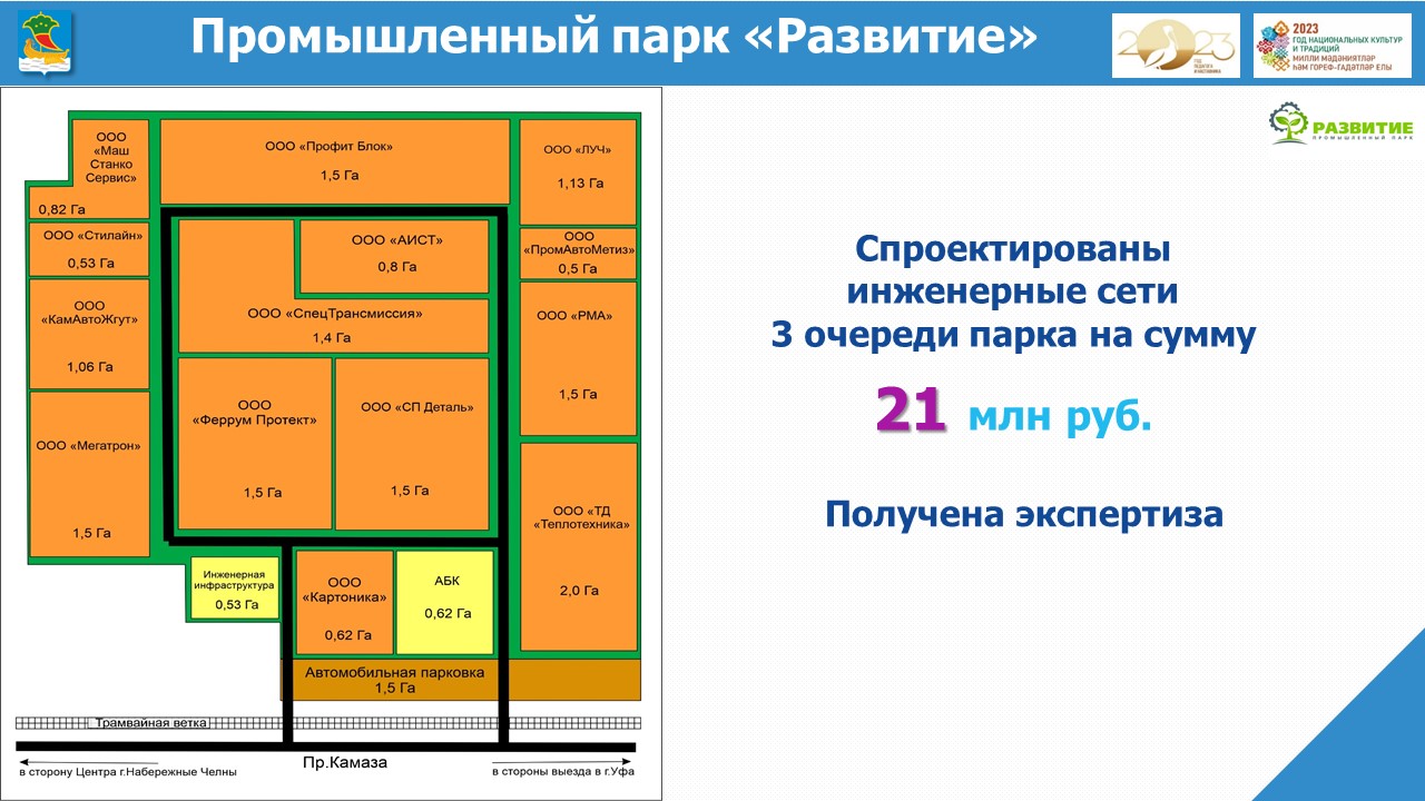 Кроме того, активно развивающейся промышленной площадкой является парк «Развитие». При поддержке правительства Республики Татарстан на сумму 21 млн рублей спроектированы инженерные сети трех очередей парка, получена экспертиза.