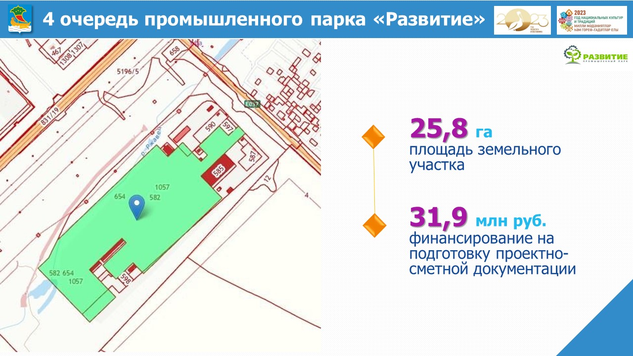 В связи с большим запросом от предпринимателей ведется работа по созданию четвертой очереди промпарка «Развитие». Из бюджета города на разработку проектно-сметной документации 31,9 млн рублей.
