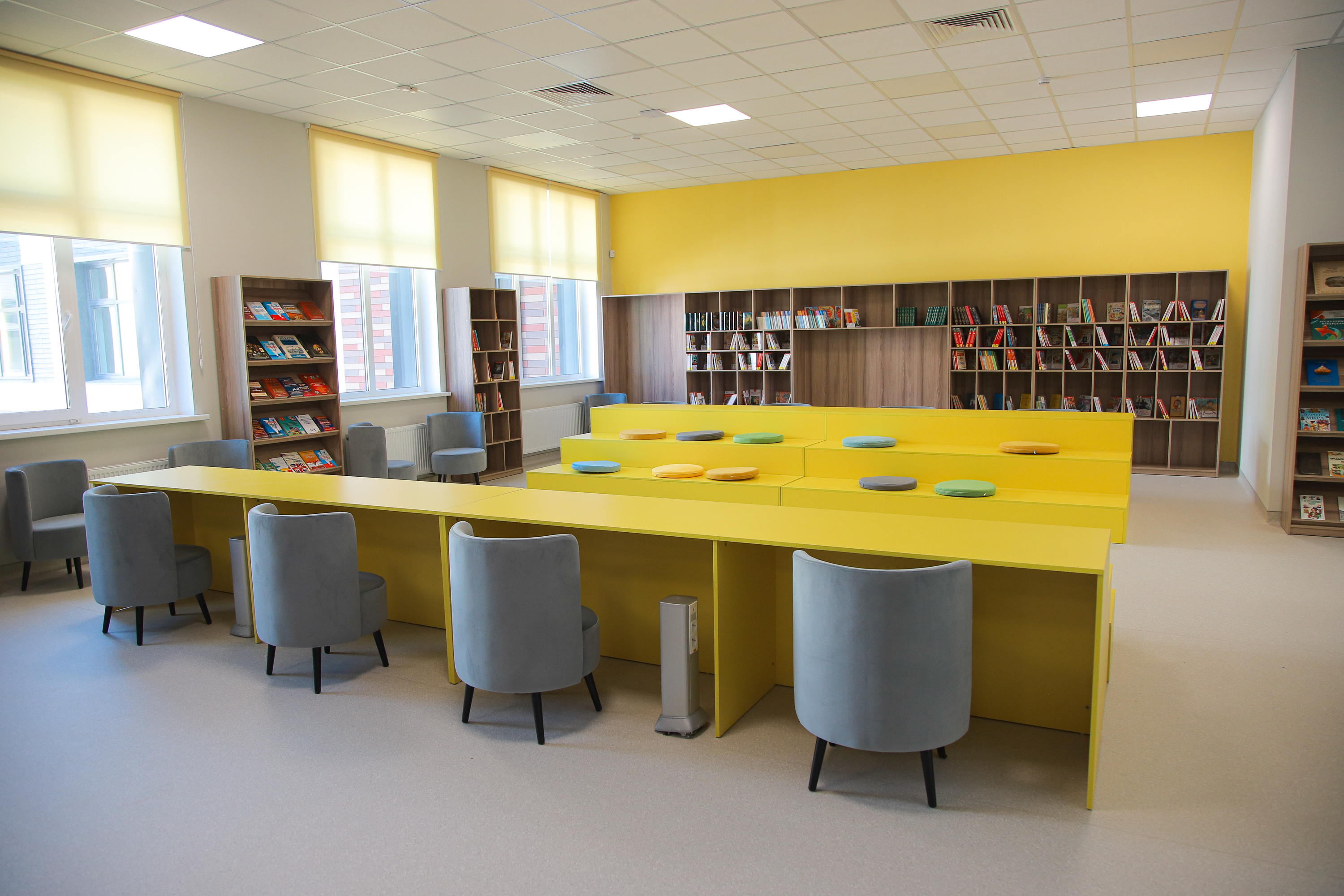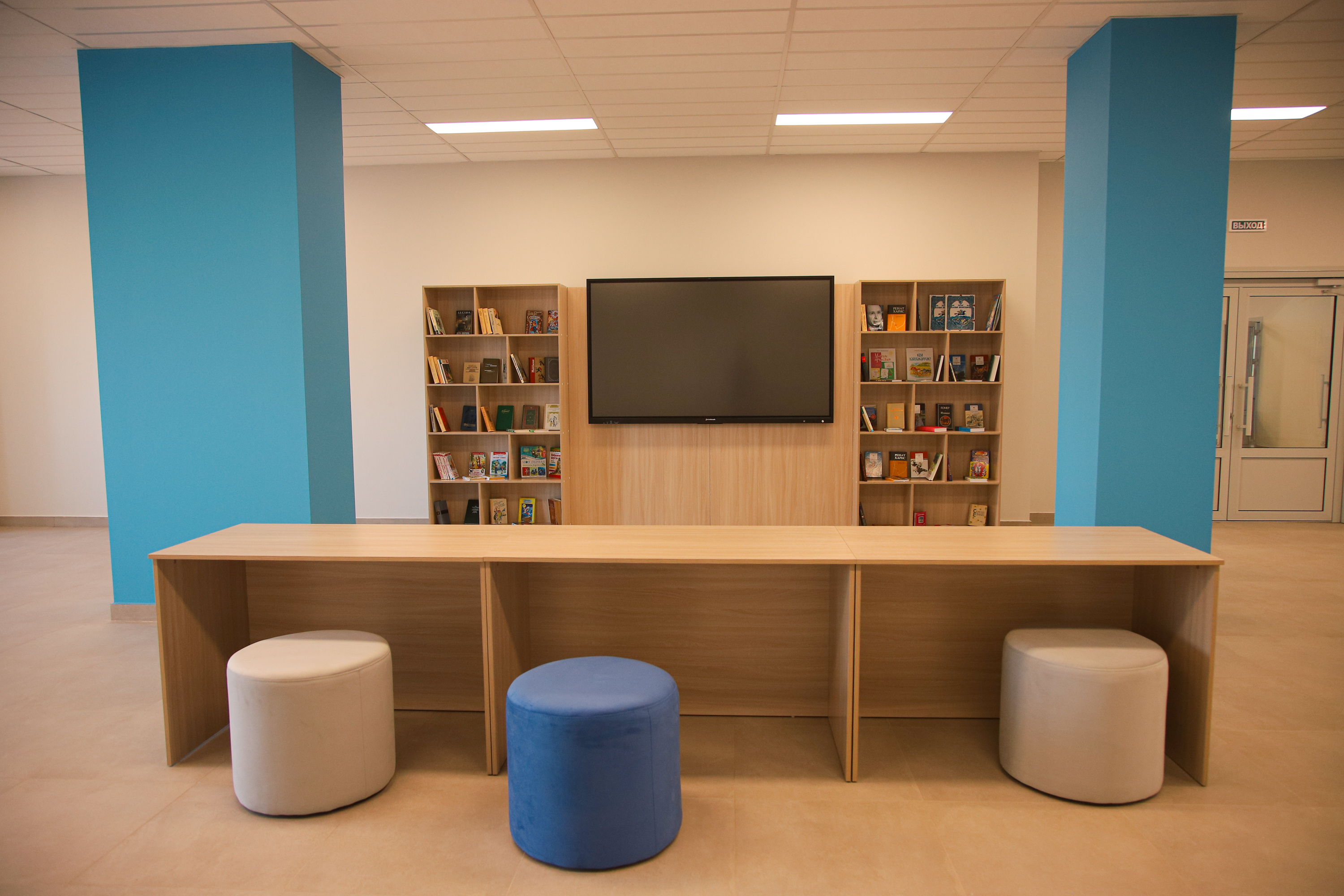 Также гимназисты смогут отдохнуть на перемене в светлой, просторной библиотеке. Здесь представлены оригинальные подиумы, на которых можно сидеть.