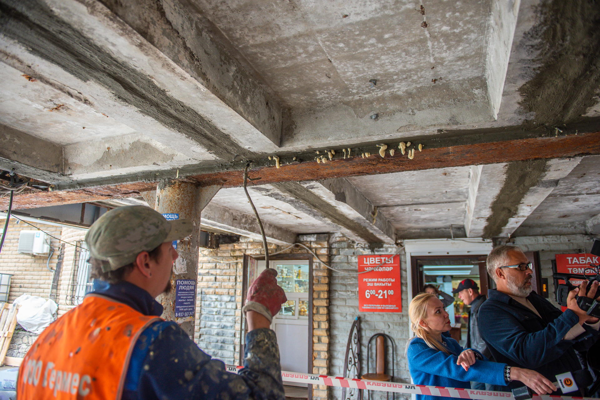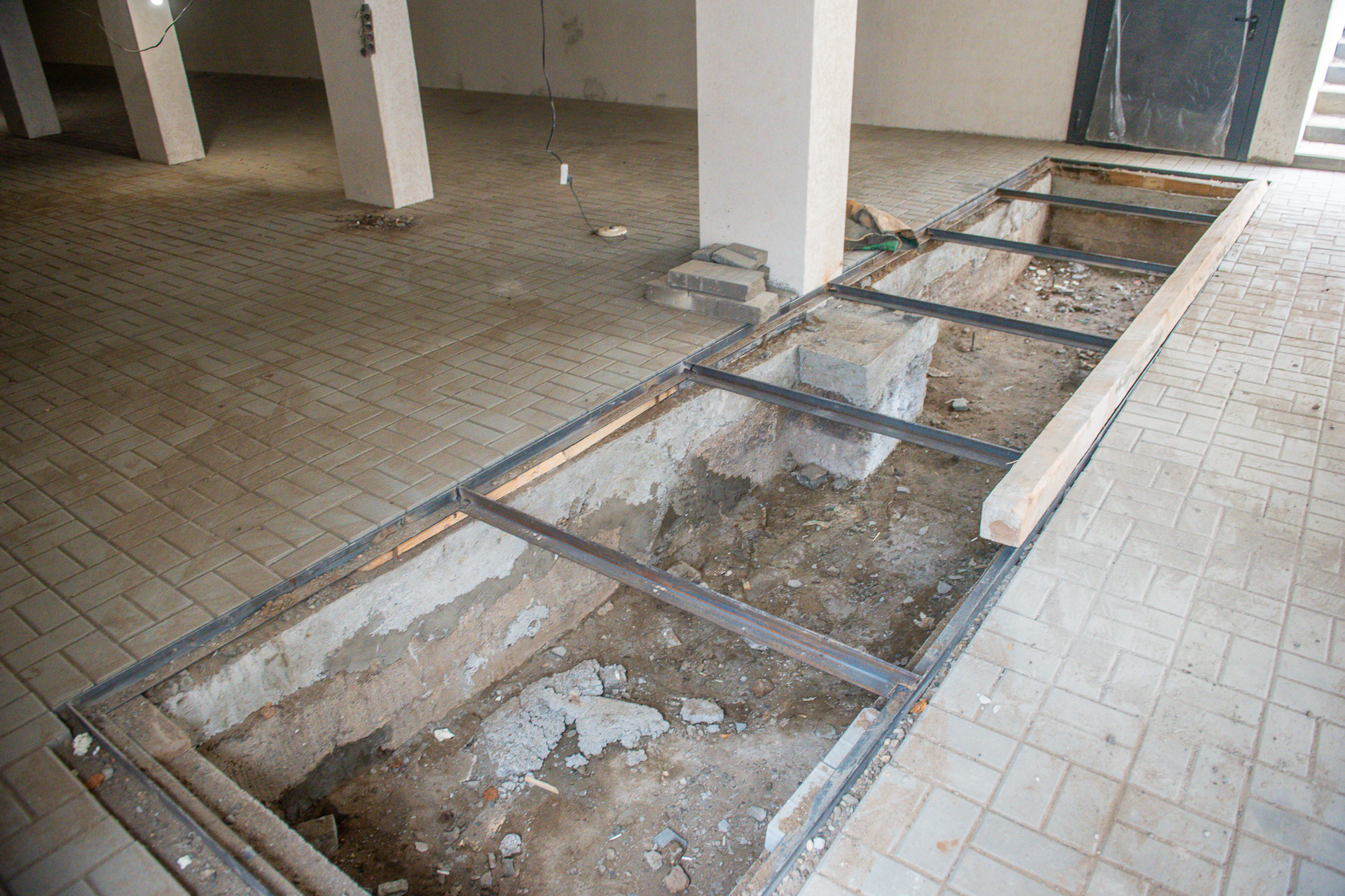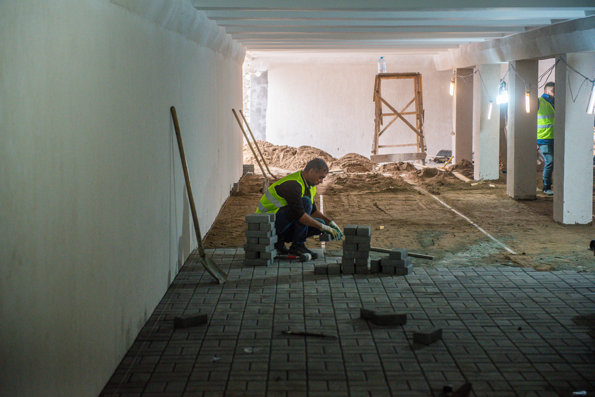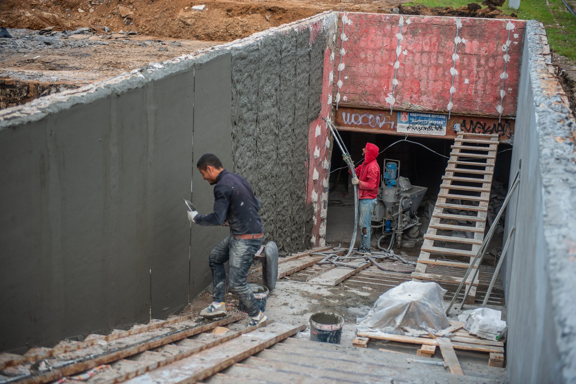 Практически вся работа внутри пешеходных переходов – ручная работа. Технику в таких условиях использовать невозможно, рабочие сами спускают материалы, а бетон изготавливается внутри.