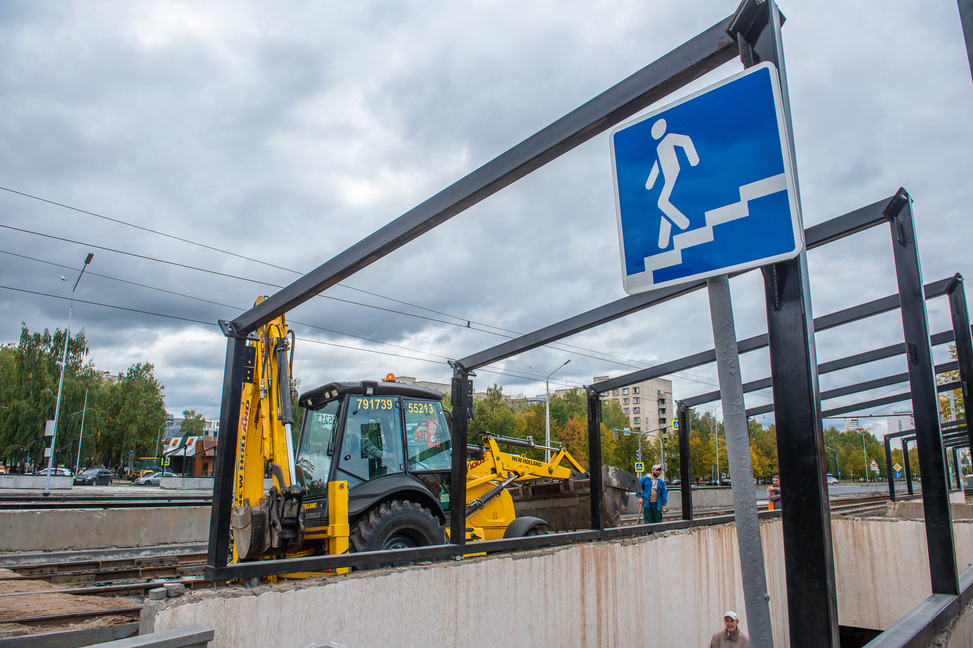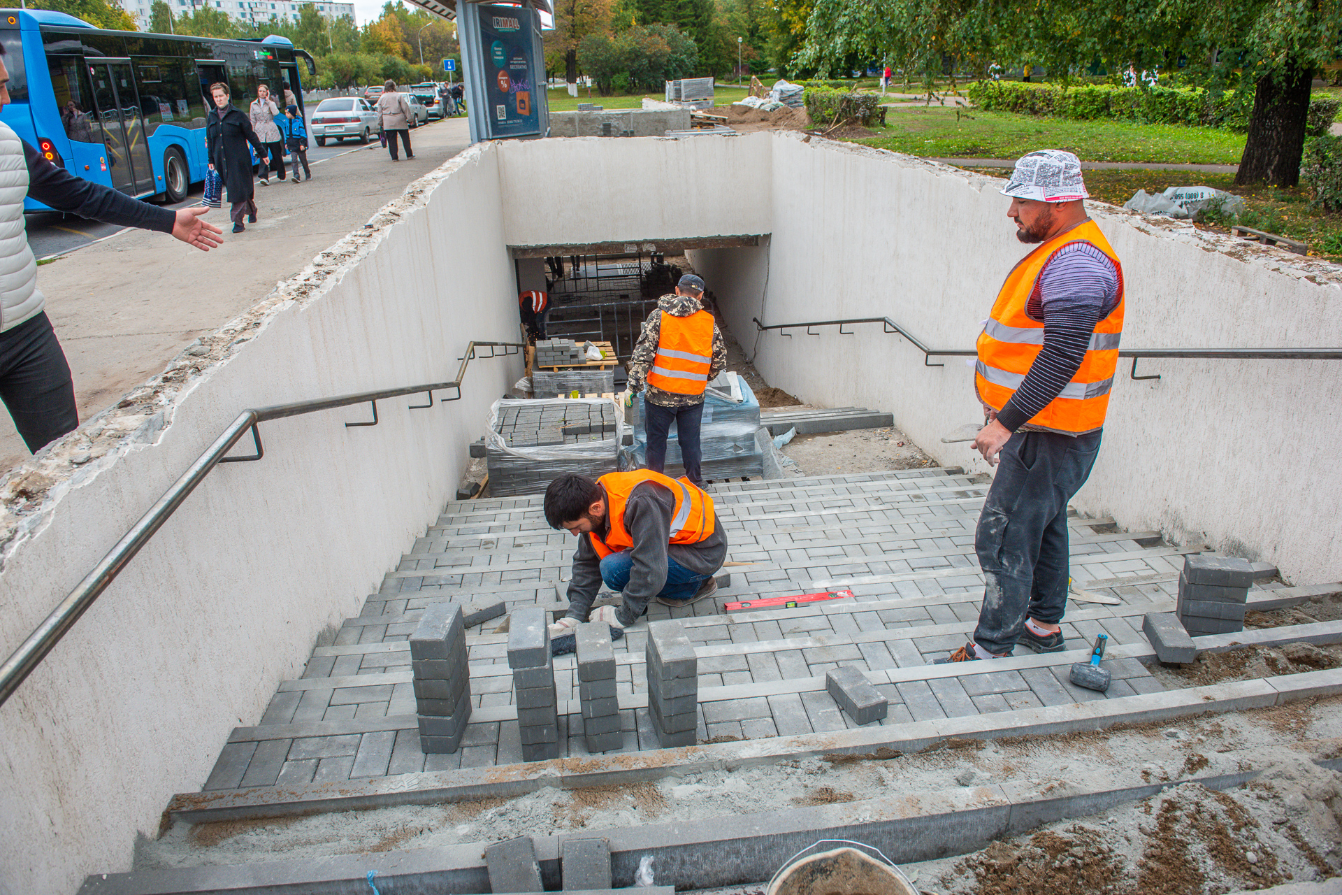 В подземном переходе на ост. Райисполком идет монтаж ступеней из брусчатки. Смонтированы поручни, они будут покрашены. К покраске готовы и потолки. Устанавливаются новые дождеприемники, ливневки смонтированы. На лестницах идет подготовка к установке пандусов. Во всех переходах установят стандартные пандусы шириной по 30 см с аналогичным расстоянием между «рельсами».