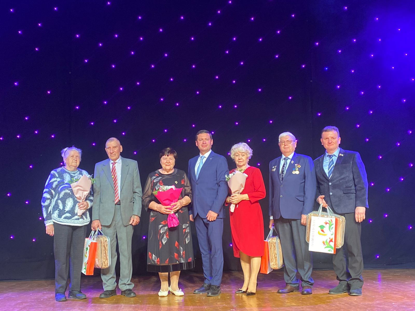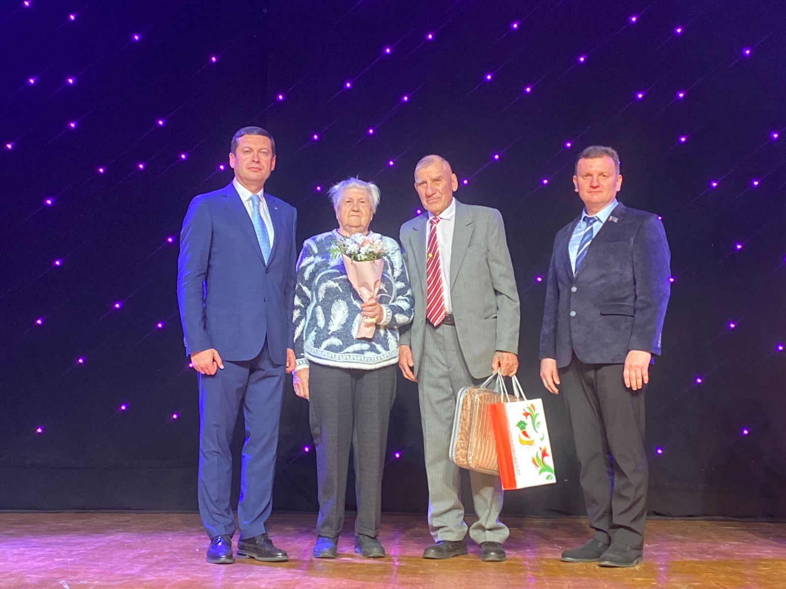 В этот праздничный день на сцене чествовали «золотых» и «бриллиантовых» юбиляров семейной жизни - рассказали истории знакомства и трудовые достижения каждой пары. Поздравили бриллиантовых юбиляров Нефёдовых Владимира Ивановича и Надежду Александровну, которые прожили в любви и согласии 60 лет; золотых юбиляров Минхазеевых Миннахмата Минхазеевича и Федию Гайсовну, Подласовых Сергея Ивановича и Наталью Ивановну – семьи прожили в любви и согласии 50 лет. Радостное событие с юбилярами разделили их дети, внуки, правнуки и друзья, которые поддерживали своих близких.