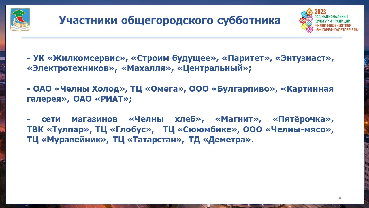 Первый заместитель руководителя Исполнительного комитета города Илья Зуев доложил, что в ходе проведения осеннего месячника выполнены работы: посадка деревьев и кустарников 22 457 тыс. шт.; очистка территорий от листвы и мусора на площади 6 525 га; вывоз 6 529 куб. м. мусора и растительных отходов; санитарная обрезка 8 500 деревьев и 10 000 кустарников; ревизия и ремонт спортивных и детских игровых площадок, уголков отдыха, скамеек на территории жилищного фонда. В ходе месячника прошел традиционный общегородской субботник.