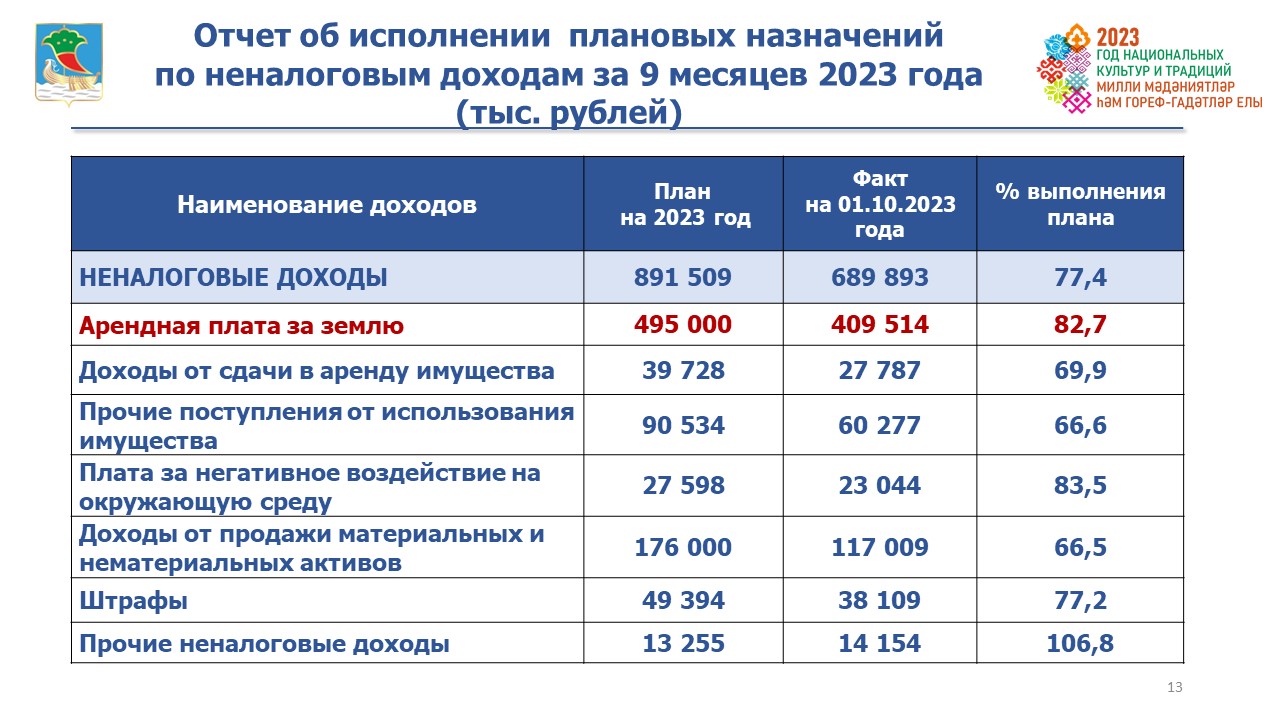Доля неналоговых доходов в собственных доходах бюджета составила 13%. В бюджет поступило 690 млн рублей, годовые плановые назначения исполнены на 77% при нормативе 75%.