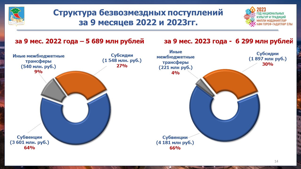 Доходные источники бюджета города за 9 месяцев 2023 года составили 12 млрд 902 млн рублей. Об этом в ходе аппаратного совещания сообщила заместитель руководителя Исполнительного комитета, начальник управления финансов Светлана Мулюкова. Из них собственные доходы составляют 5 млрд 494 млн рублей, из них налоговые доходы – 4 млрд 804 млн рублей, неналоговые доходы – 690 млн рублей и межбюджетные трансферты – 7 млрд 408 млн рублей.